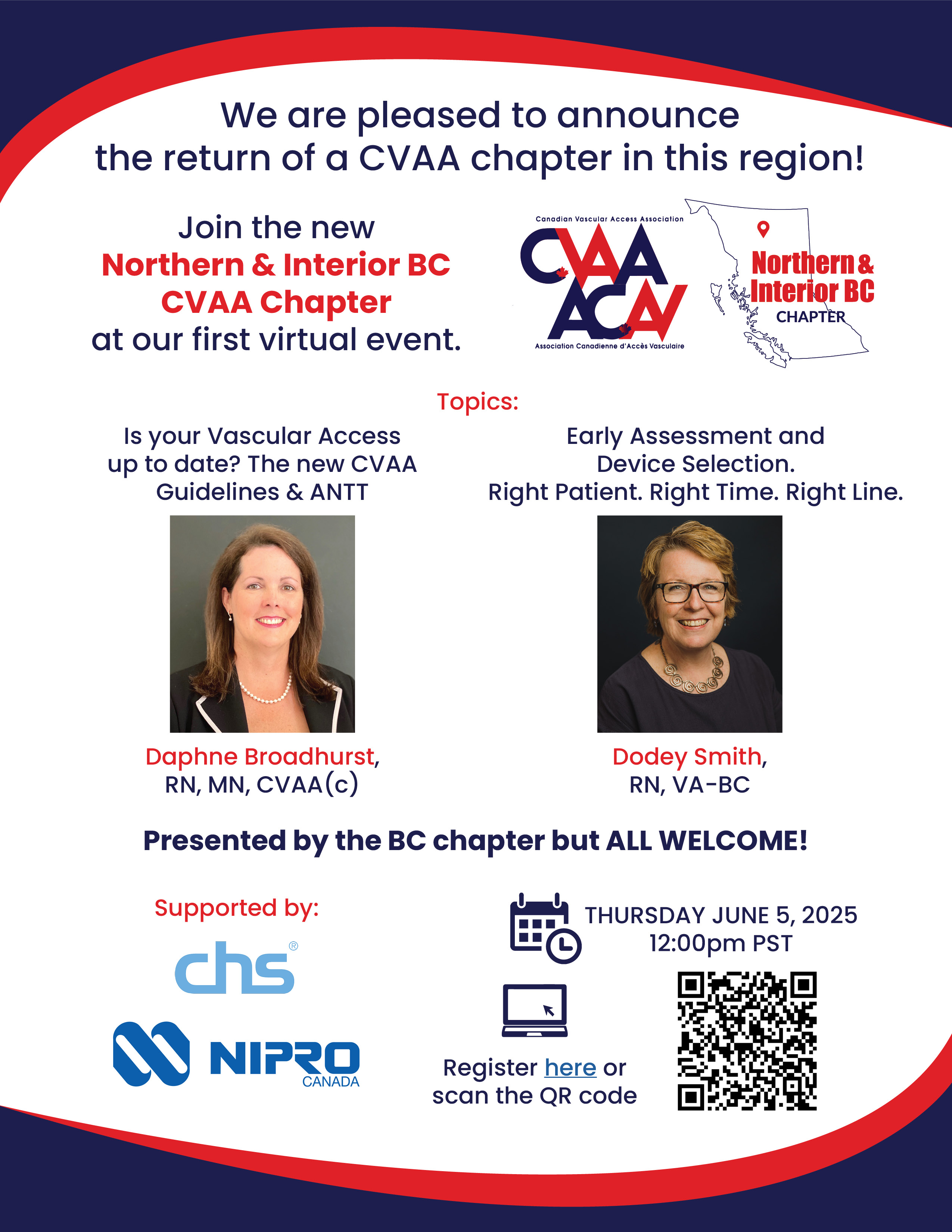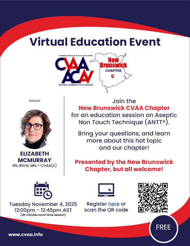 ARCHIVED SESSION: June 5, 2025 (full flyer here) Northern & Interior BC CVAA Chapter Education Event featuring CVAA Guidelines, ANTT and Device Selection presented by Daphne Broadhurst, RN, MN, CVAA(c) and Dodey Smith, RN, VA-BC To access the recording, log in and view under Members Area> CVAA Webinar Series