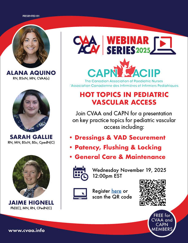 ARCHIVED SESSION: November 19, 2025 - Joint webinar with CAPN Hot Topics in Pediatric Vascular Access presented by Alana Aquino, BScN, MN, RN, CVAA(c), Sarah Gallie, RN, MN, BScN, BSc, CpedN(C), Jaime Hignell, PhD(C), MN, RN, CPedN(C) To access the recording, log in and view under Members Area> CVAA Webinar Series