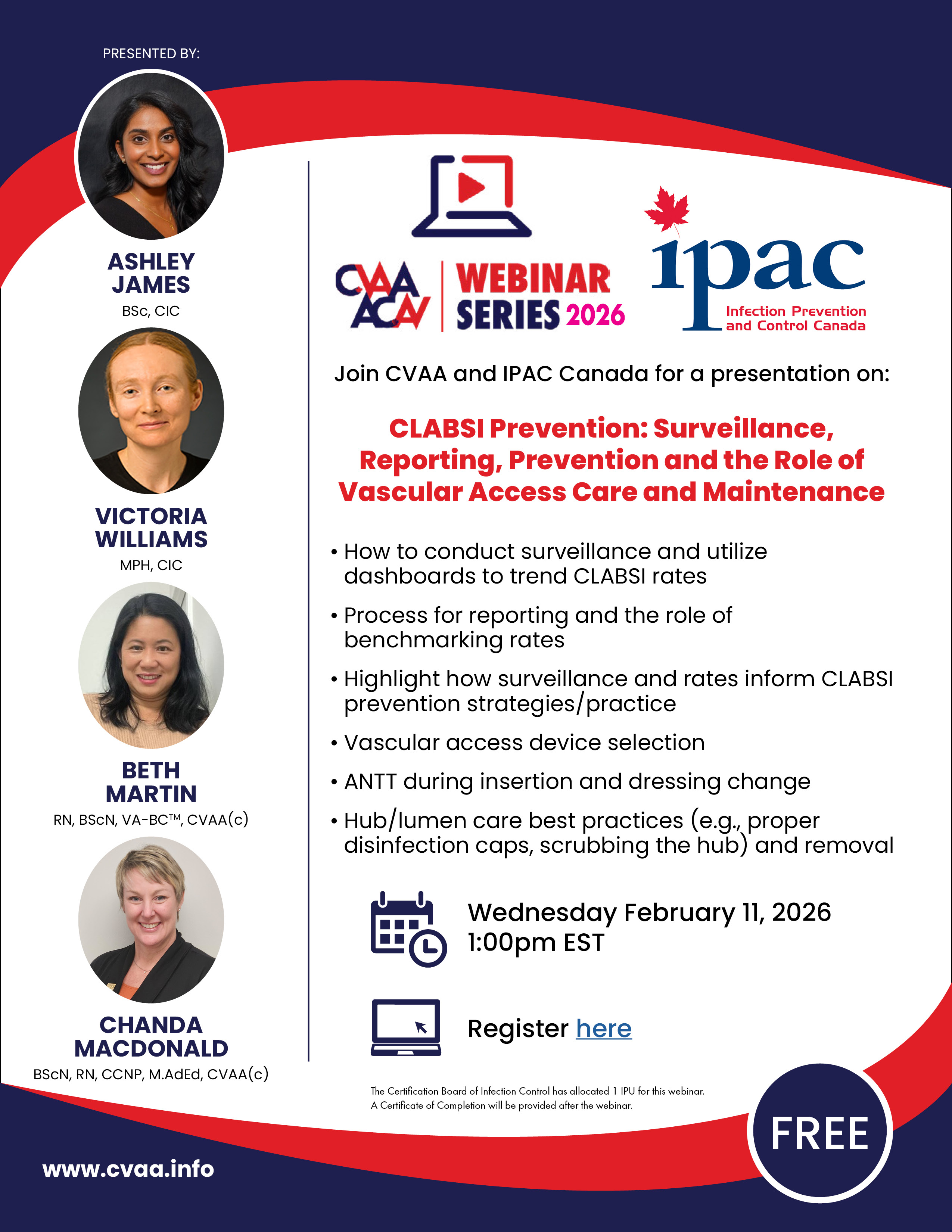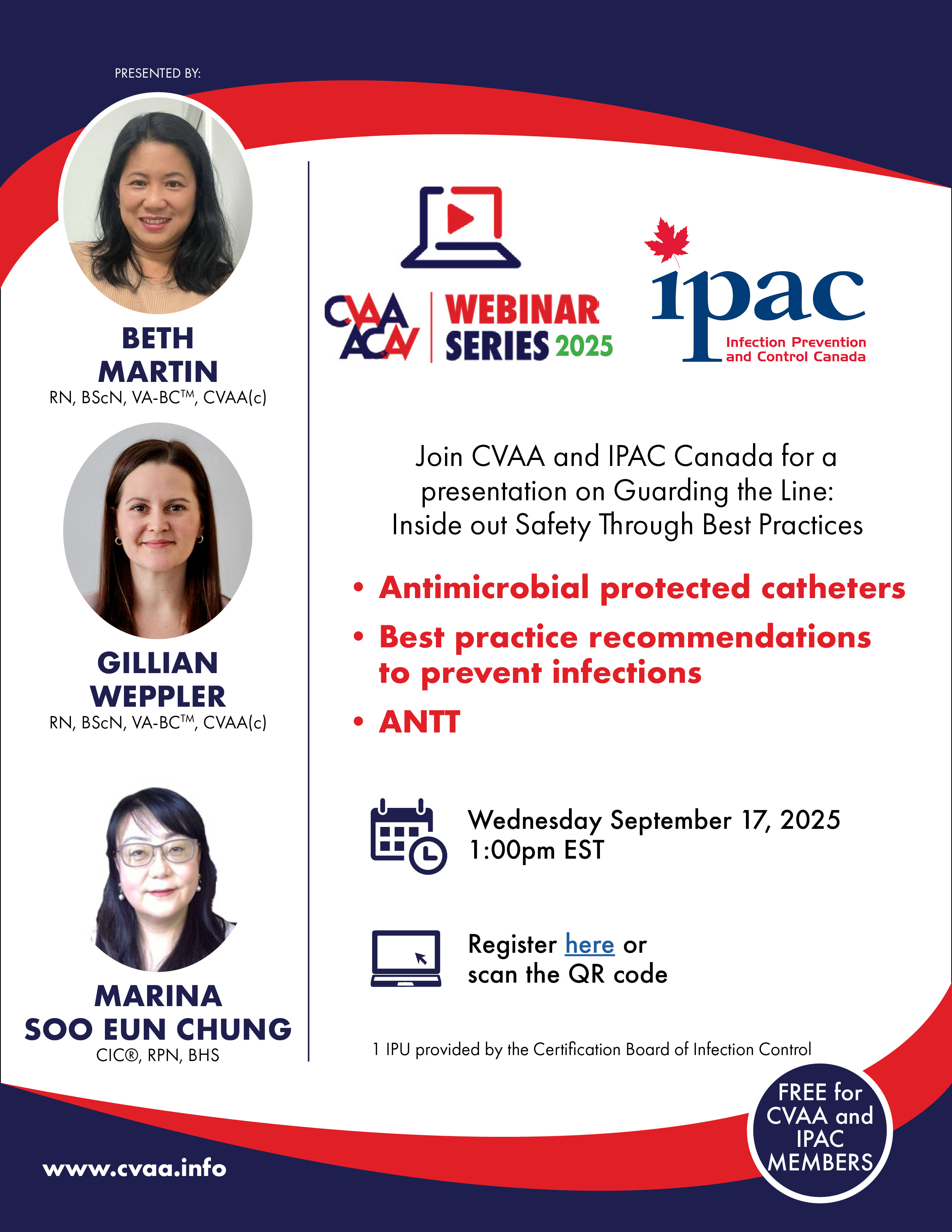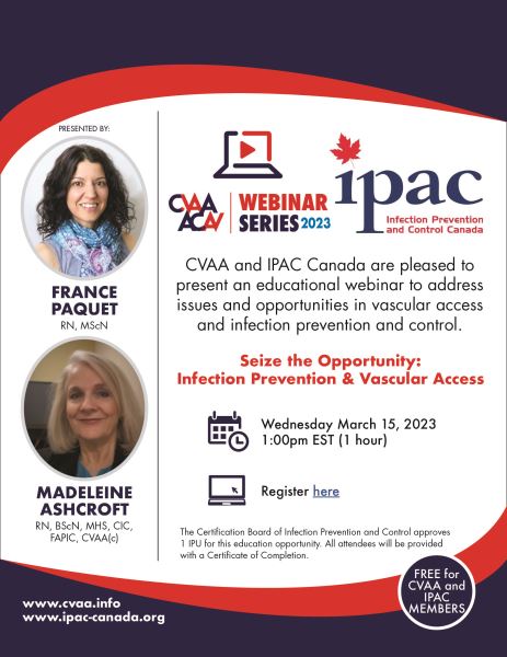 ARCHIVED SESSION March 15, 2023 (full flyer here) Our first joint webinar with Infection Prevention & Control Canada Seize the Opportunity - Infection Prevention & Vascular Access presented by France Paquet, RN, MScN with Madeleine Ashcroft, RN, BScN, MHS, CIC, FAPIC, CVAA(c). To access the recording, log in and view under Members Area> CVAA Webinar Series