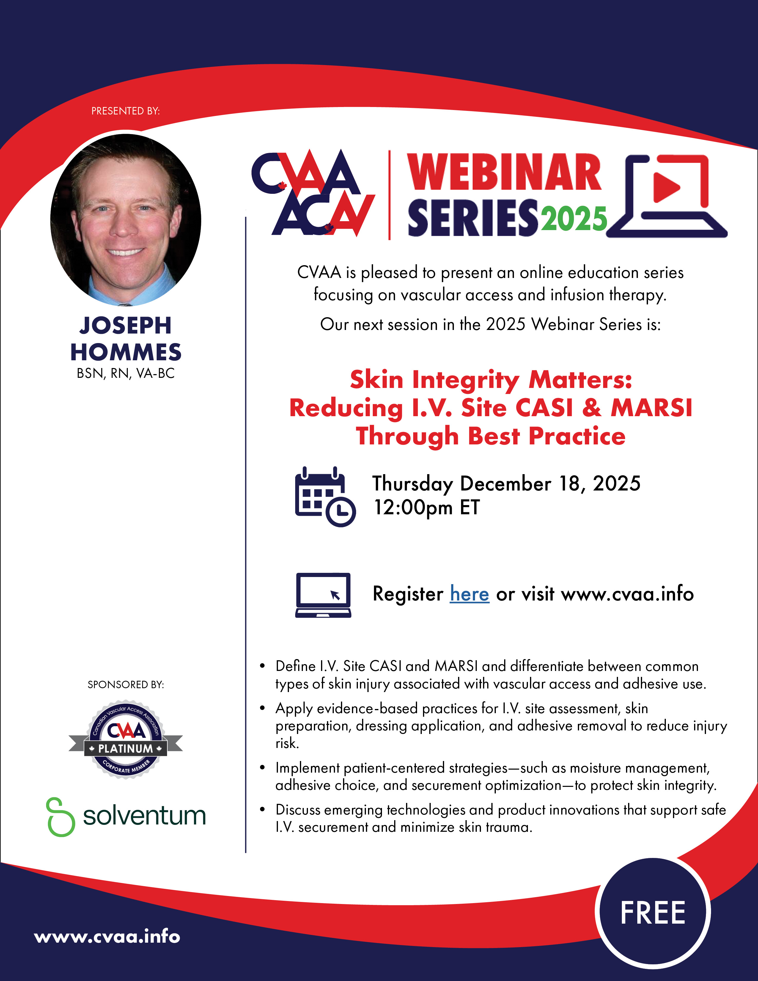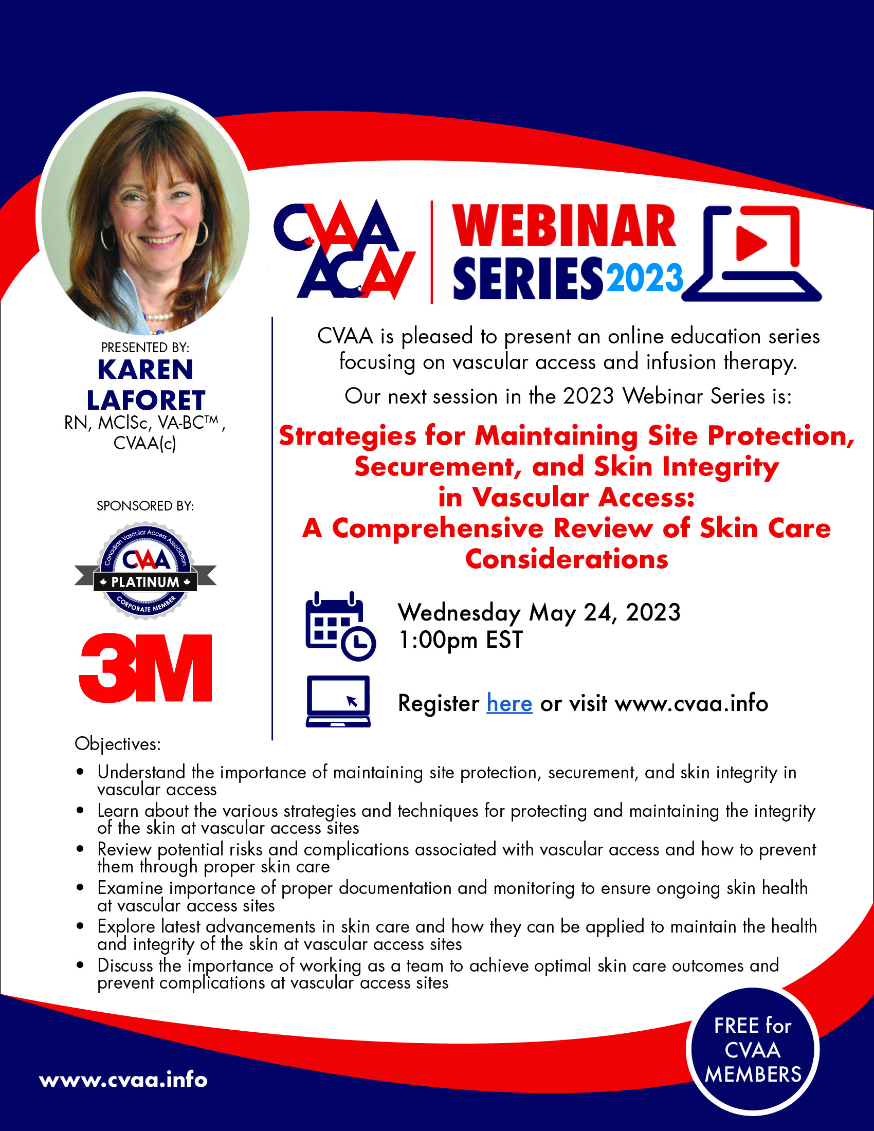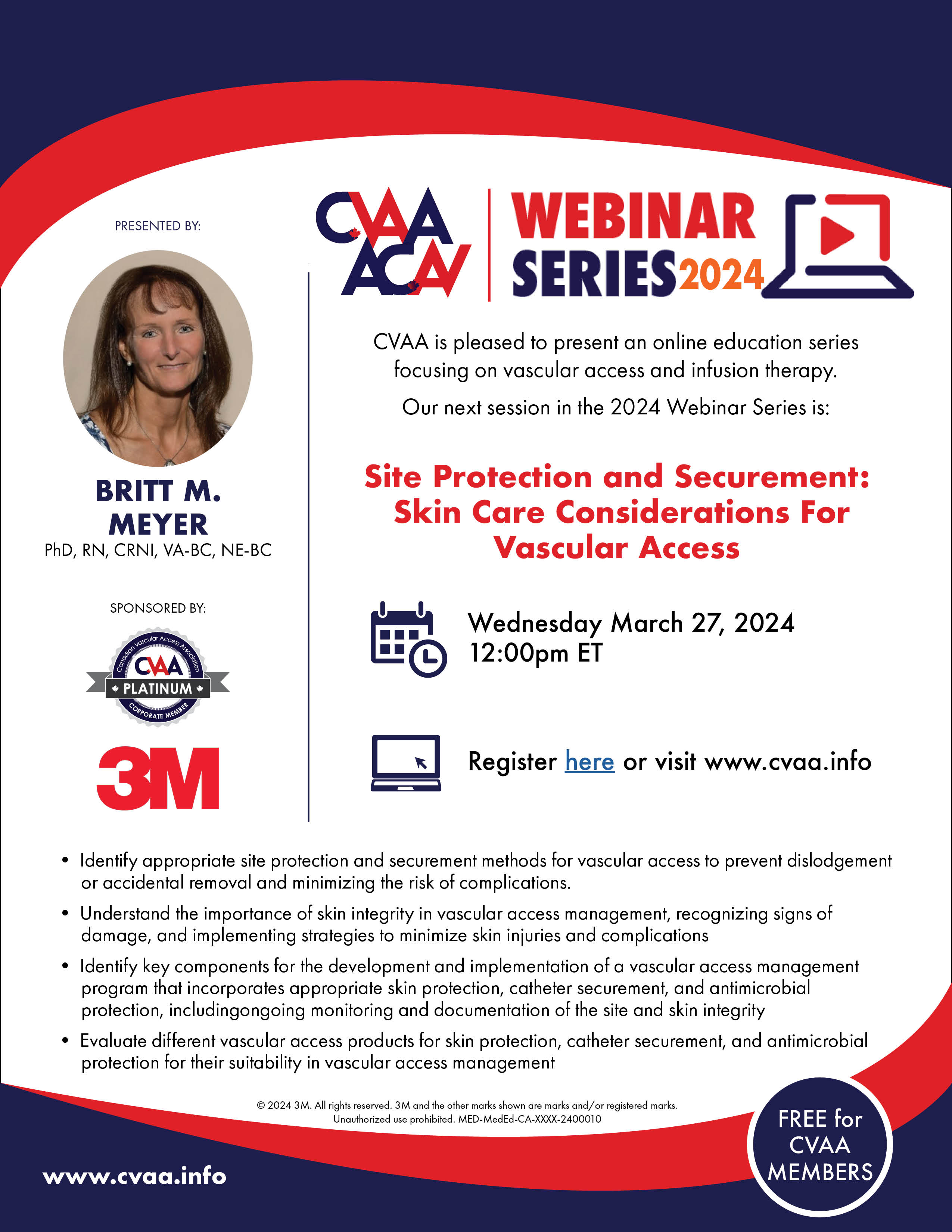 ARCHIVED SESSION: March 27, 2024 (full flyer here) Site Protection and Securement: Skin Care Considerations For Vascular Access - Britt M. Meyer, PhD, RN, CRNI, VA-BC, NE-BC Sponsored by 3M Canada To access the recording, log in and view under Members Area> CVAA Webinar Series