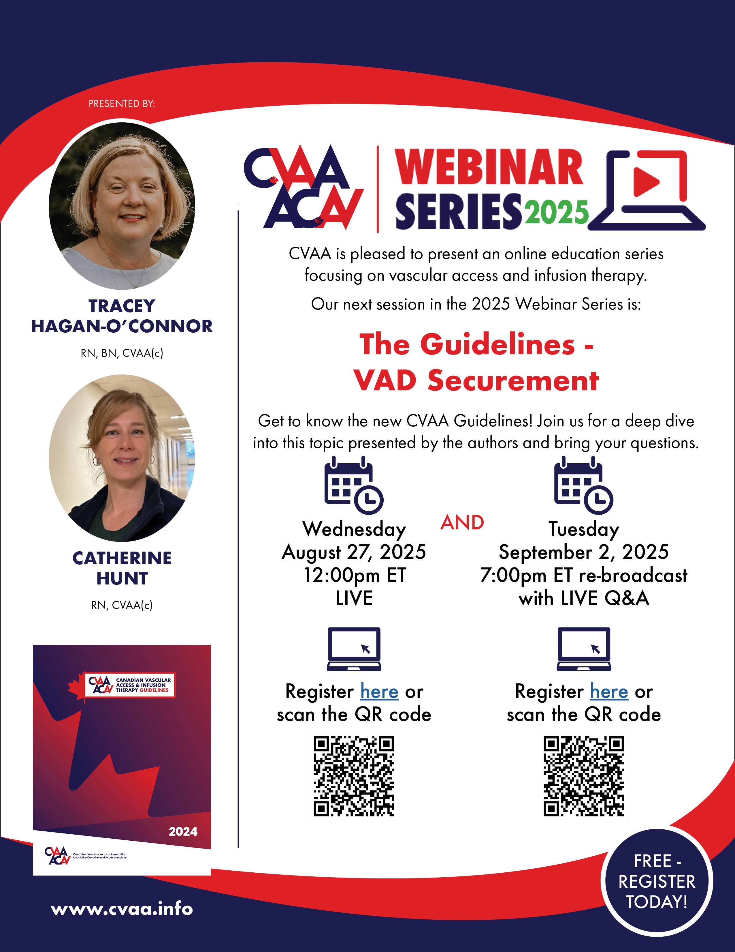 ARCHIVED SESSION: August 27 2025 and September 2 2025 CVAA Webinar Series: The Guidelines - VAD Securement presented by GDG author Tracey Hagan-O’Connor, RN, BN, CVAA(c), Catherine Hunt, RN, CVAA(c) To access the recording, log in and view under Members Area> CVAA Webinar Series