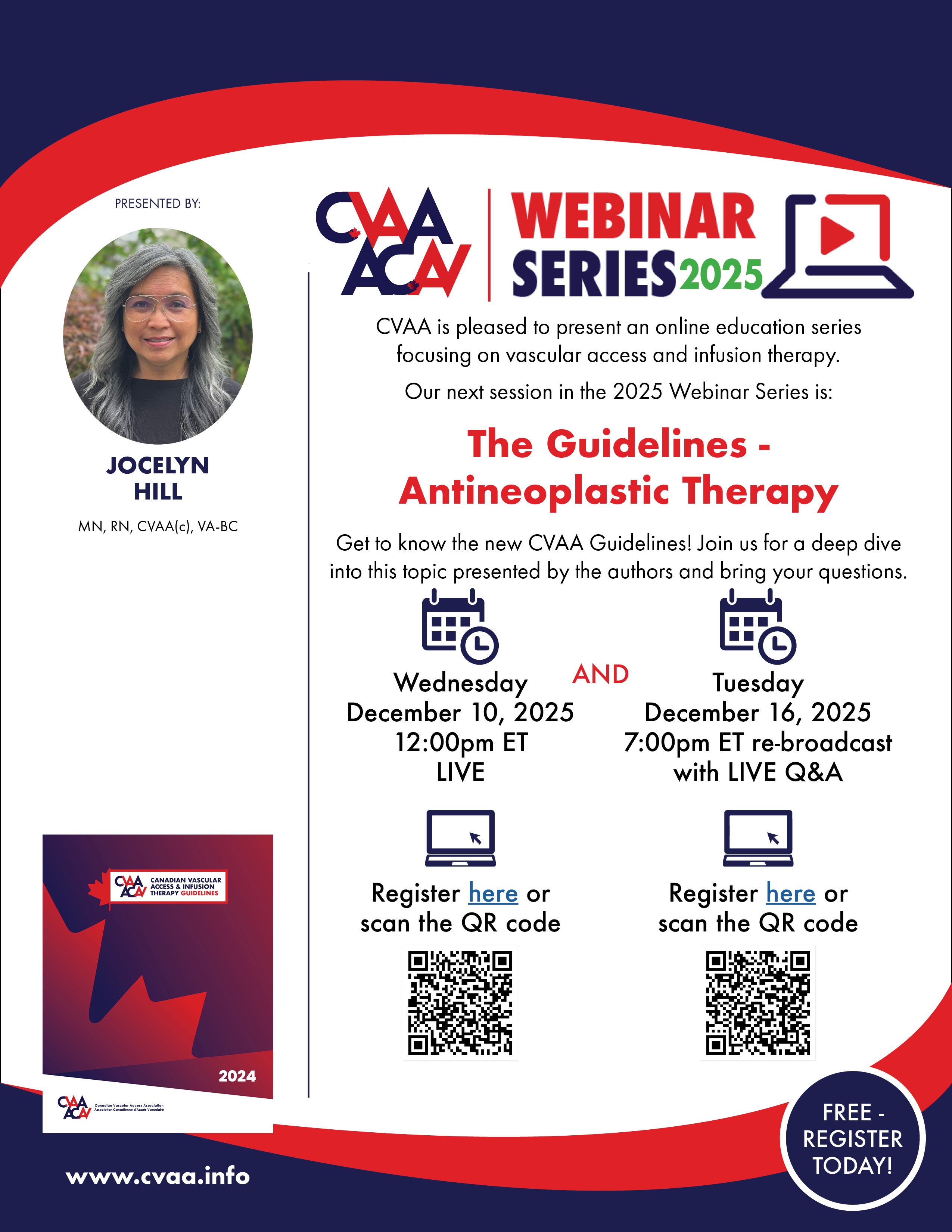 ARCHIVED SESSION: May 21, 2025 CVAA 2024 Guidelines - Update for Antineoplastics (joint with CANO) presented by Jocelyn Hill MN, RN, CVAA(c), VA-BC™ To access the recording, log in and view under Members Area> CVAA Webinar Series