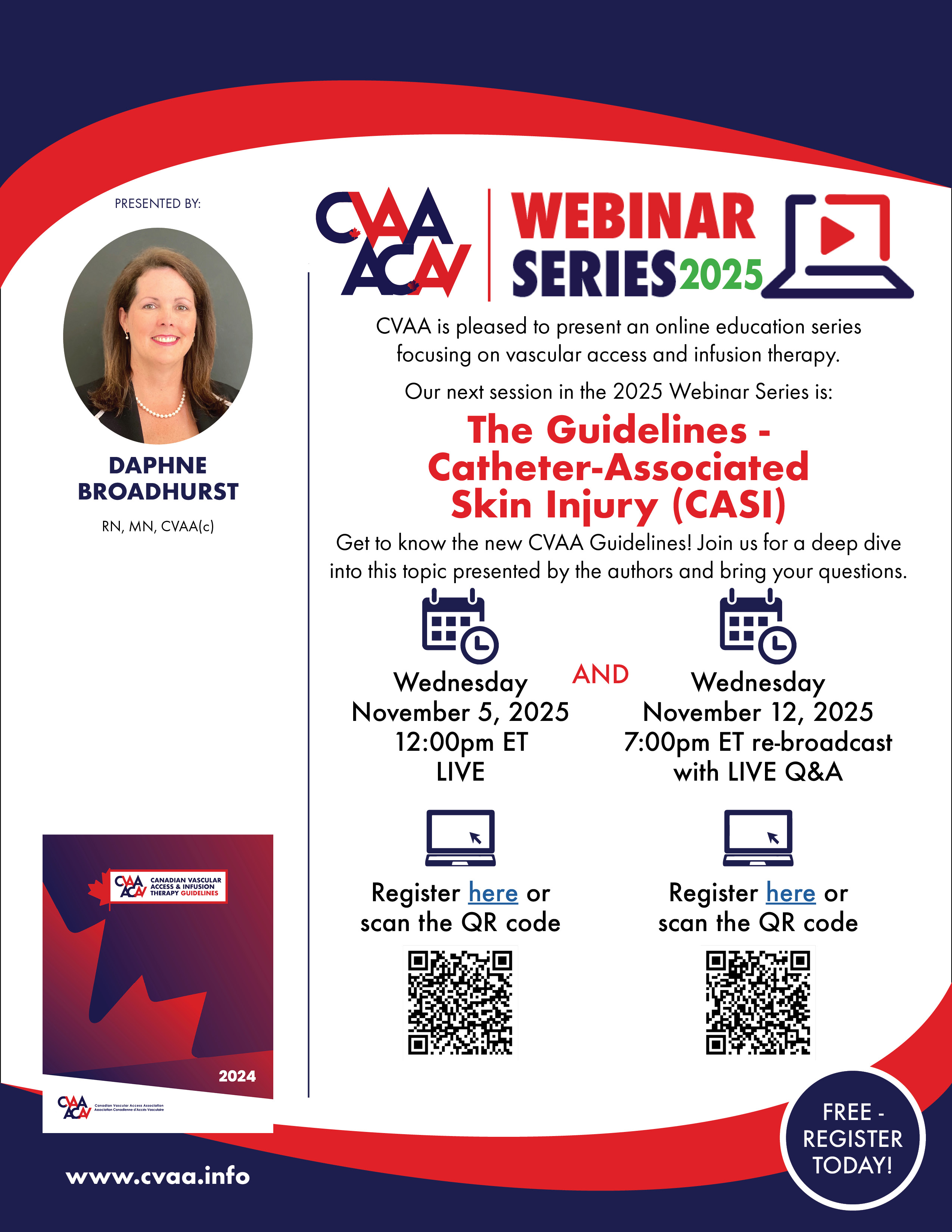 ARCHIVED SESSION: November 5 and 12, 2025 - CVAA Webinar Series: The Guidelines - Catheter-Associated Skin Injury (CASI) presented by GDG author Daphne Broadhurst, RN, MN, CVAA(c).To access the recording, log in and view under Members Area> CVAA Webinar Series