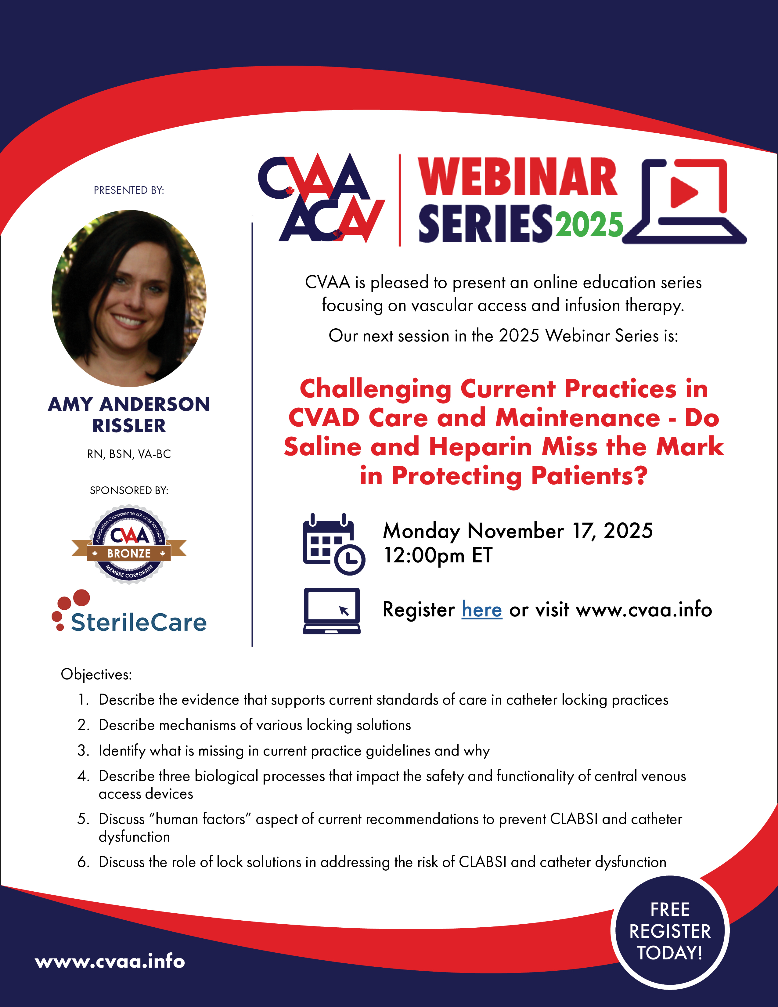 ARCHIVED SESSION: November 17, 2025 - CVAA Webinar Series: Challenging Current Practices in CVAD Care and Maintenance - Do Saline and Heparin Miss the Mark in Protecting Patients? presented by Amy Anderson Rissler, RN, BSN, VA-BC supported by SterileCare Inc.To access the recording, log in and view under Members Area> CVAA Webinar Series