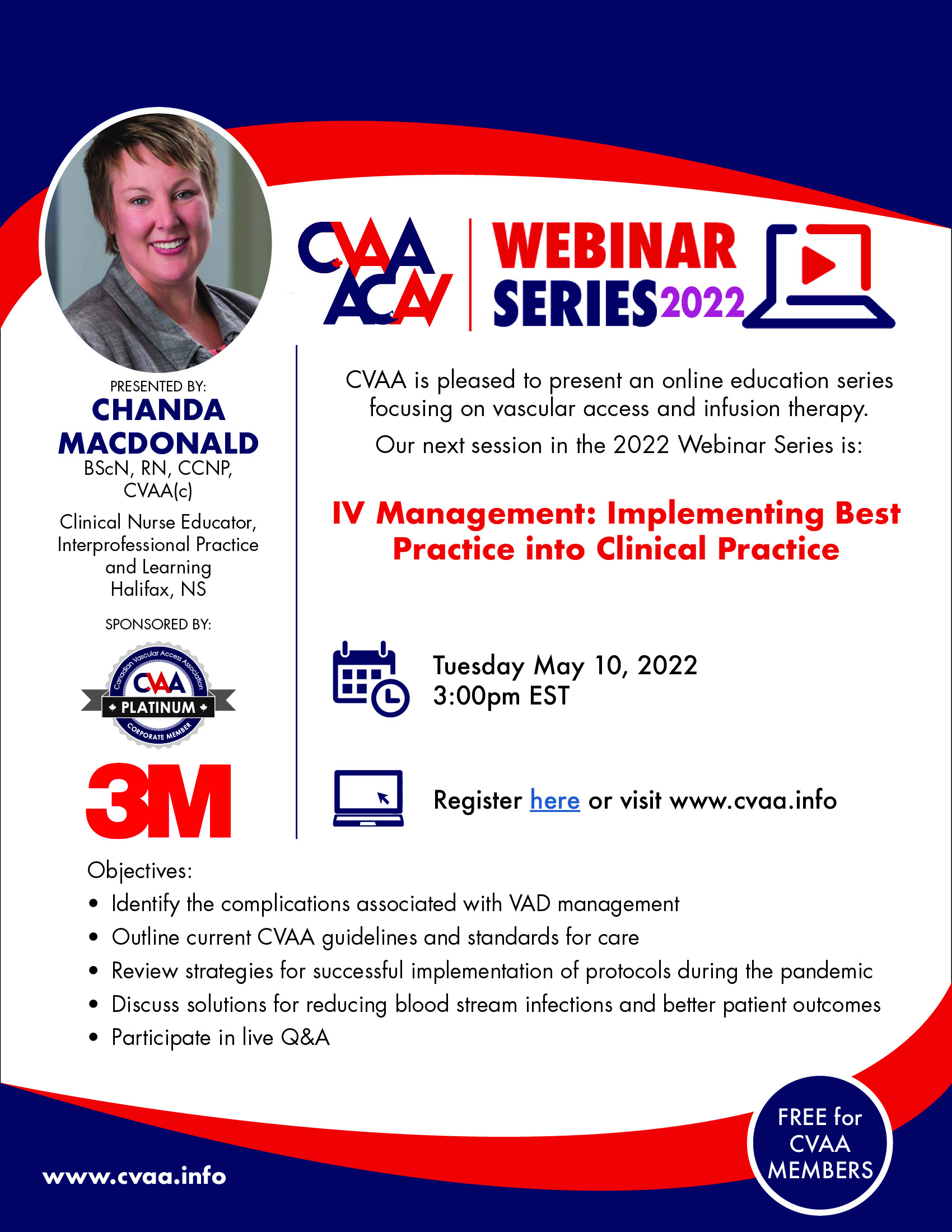 ARCHIVED SESSION May 10, 2022 (full flyer here) - IV Management: Implementing Best Practice into Clinical Practice by Chanda MacDonald, BScN, RN, CCNP, CVAA(c) Sponsored by 3M Canada To access the recording, log in and view under Members Area> CVAA Webinar Series