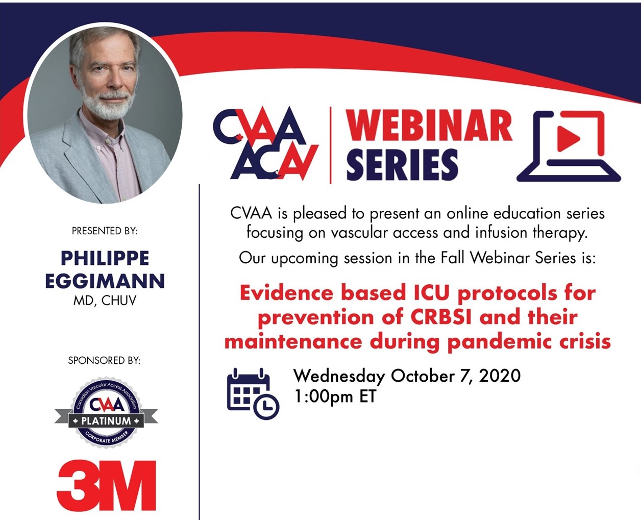 October 7, 2020 (full flyer here / ici) - Evidence based ICU protocols for prevention of CRBSI and their maintenance during pandemic crisis: Philippe Eggimann, MD, CHUV (Sponsored by 3M) BILINGUAL To access the recording, log in and view under Members Area> CVAA Webinar Series.