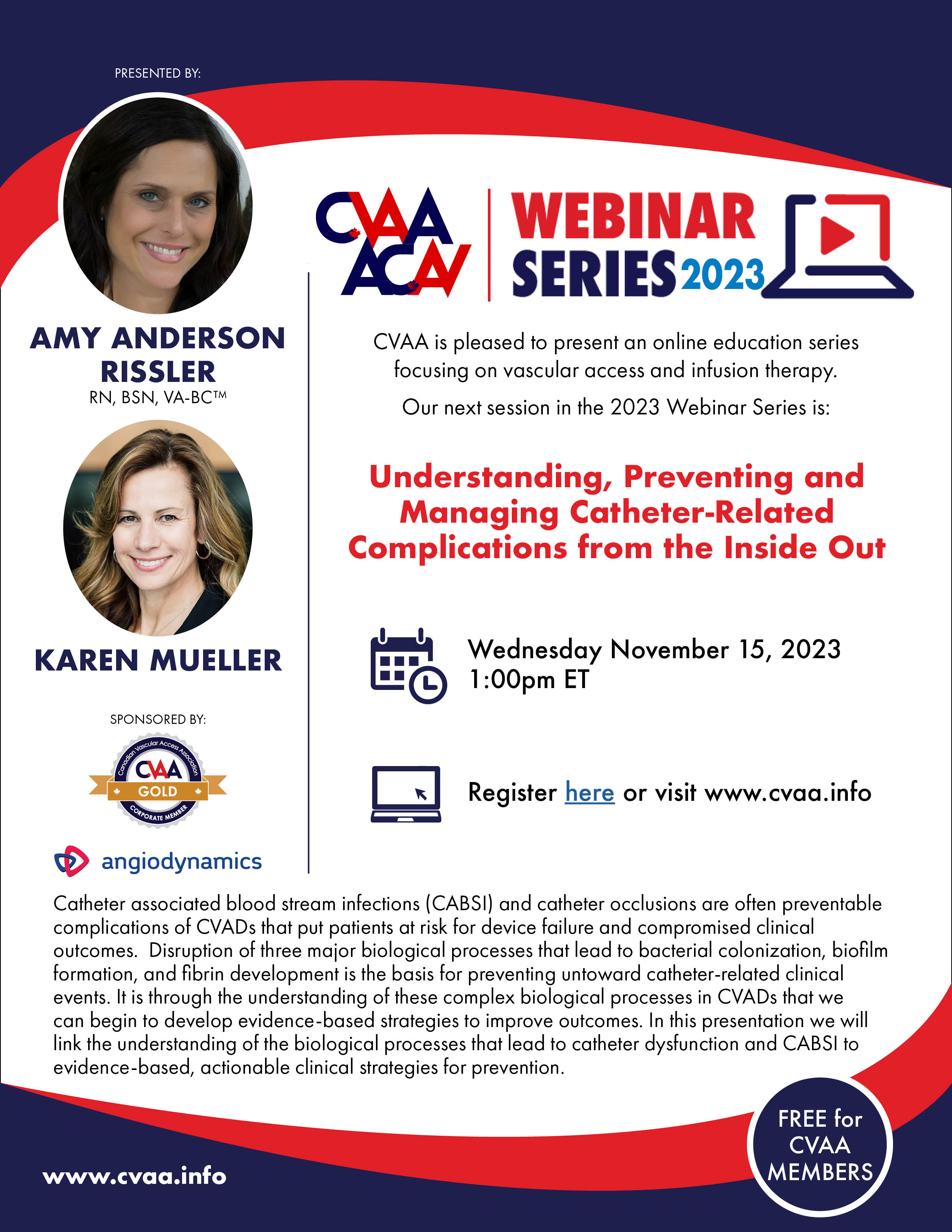ARCHIVED SESSION: November 15, 2023 (full flyer here) Understanding, Preventing and Managing Catheter-Related Complications from the Inside Out presented by Amy Anderson Rissler, RN, BSN, VA-BCTM & Karen Mueller and sponsored by AngioDynamics. To access the recording, log in and view under Members Area> CVAA Webinar Series