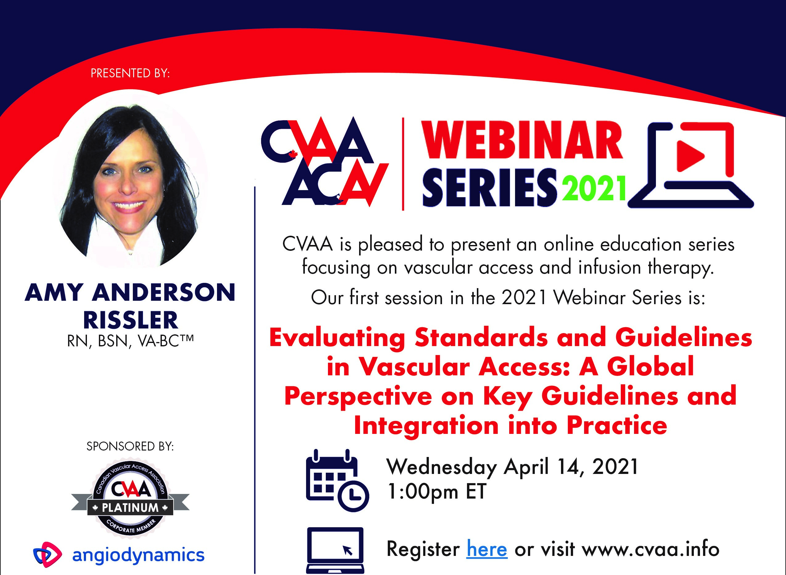 April 14, 2021 (full flyer here) - Evaluating Standards and Guidelines in Vascular Access: A Global Perspective on Key Guidelines and Integration into Practice - Amy Anderson Rissler, RN, BSN, VA-BCTM (Sponsored by AngioDynamics) To access the recording, log in and view under Members Area> CVAA Webinar Series