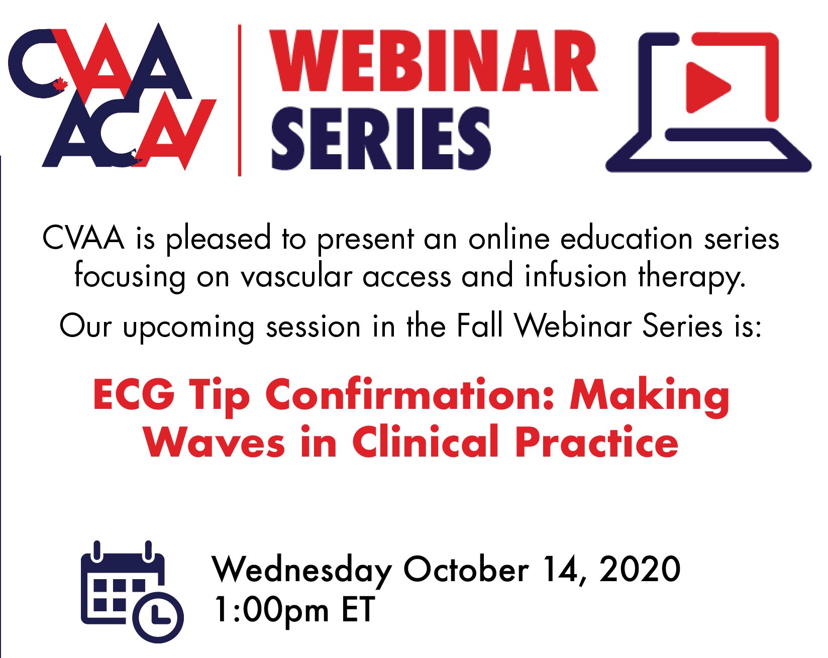 October 14, 2020 (full flyer here) - ECG Tip Confirmation: Making Waves in Clinical Practice: Jocelyn Hill, MN, RN, CVAA(c), VA-BC™ and Andrea Raynak, RN, MPH(N), CVAA(c), VA-BC™ (Sponsored by AngioDynamics) To access the recording, log in and view under Members Area> CVAA Webinar Series