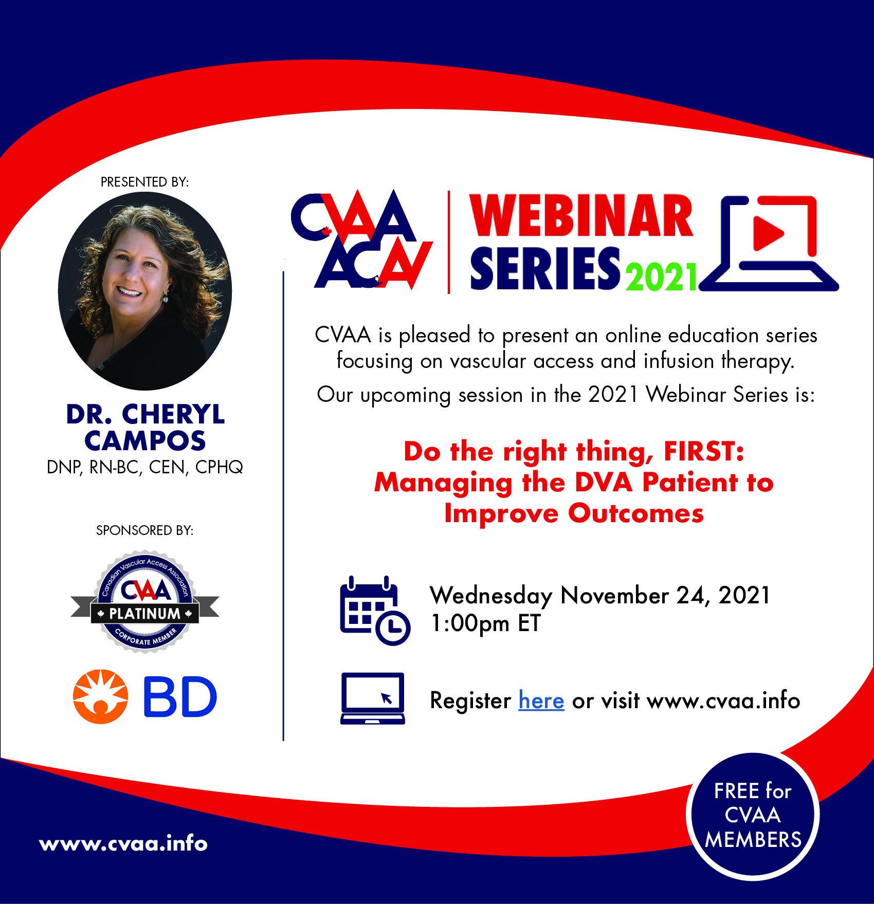 ARCHIVED SESSION November 24, 2021 (full flyer here) - Do the Right Thing, FIRST: Managing the DVA Patient to Improve Outcomes by Dr. Cheryl Campos, DNP, RN-BC, CEN, CPHQ Sponsored by BD Canada To access the recording, log in and view under Members Area> CVAA Webinar Series