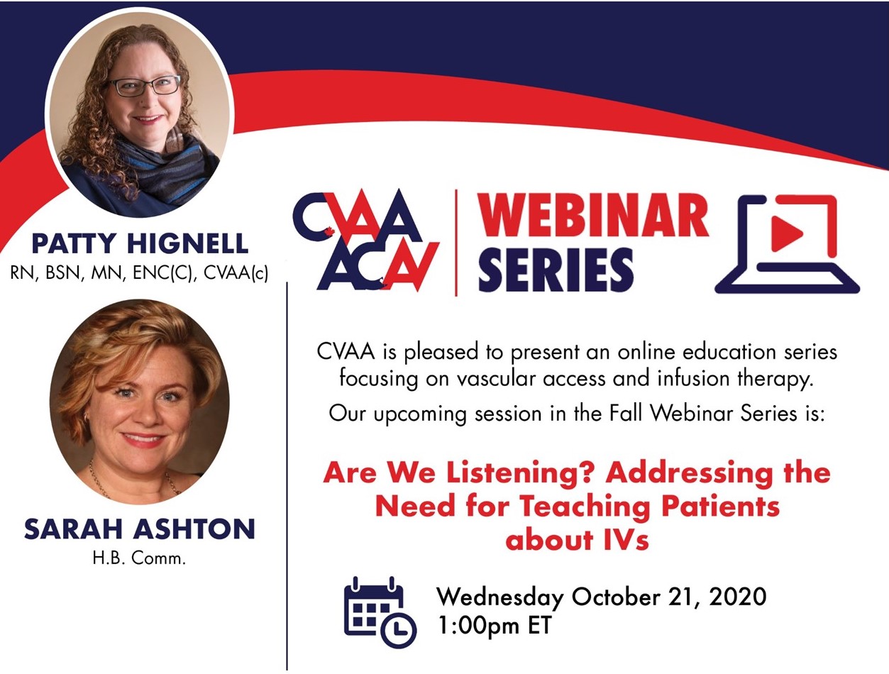 October 21, 2020 (full flyer here) - Are We Listening? Addressing the Need for Teaching Patients about IVs: Patty Hignell, RN, BSN, MN, ENC(C), CVAA(c) & Sarah Ashton, H.B. Comm. (Sponsored by BD) To access the recording, log in and view under Members Area> CVAA Webinar Series