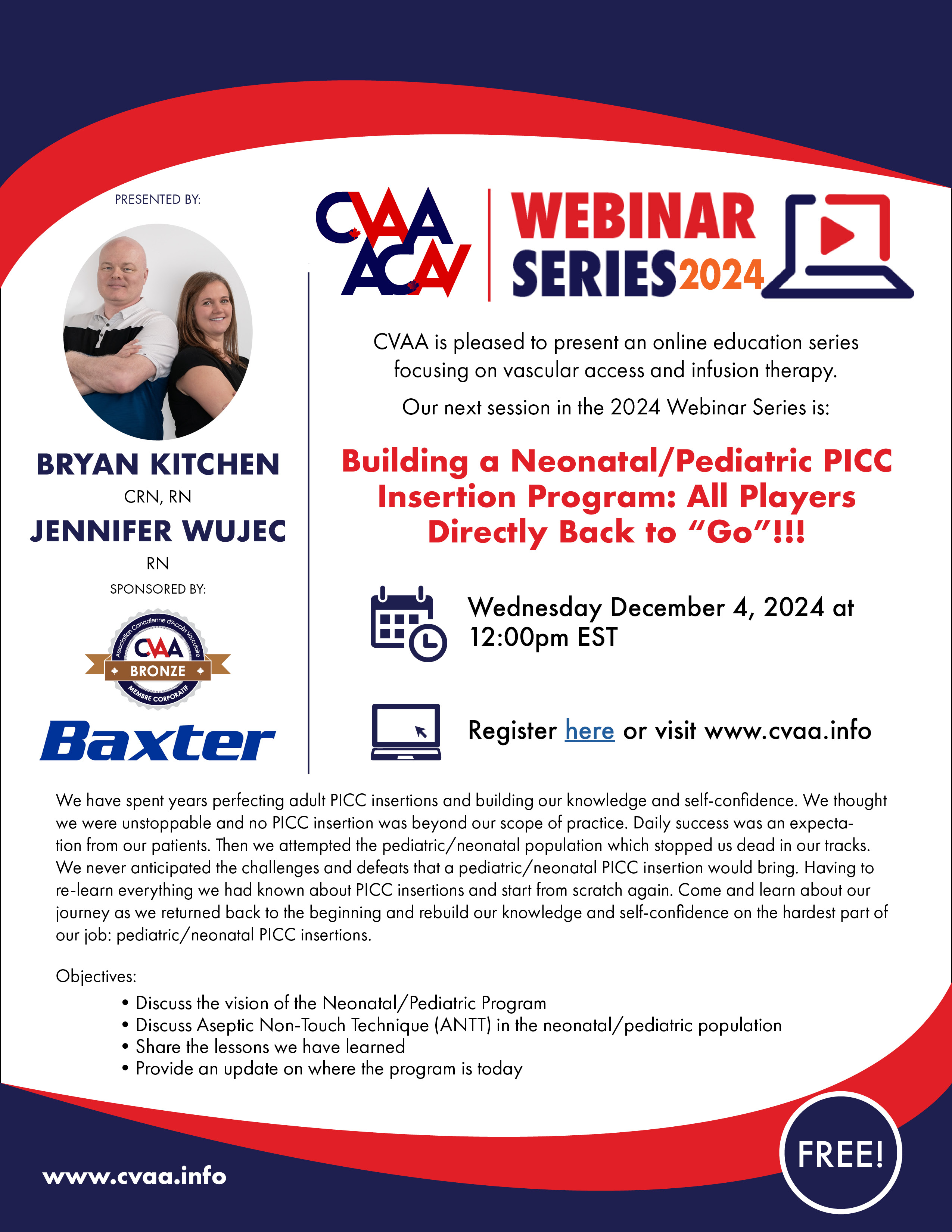 ARCHIVED SESSION: December 4, 2024 (full flyer here) Building a Neonatal/Pediatric PICC Insertion Program: All Players Directly Back to “Go”!!! - Bryan Kitchen, RN, CN and Jen Wujec, RN Sponsored by Baxter To access the recording, log in and view under Members Area> CVAA Webinar Series