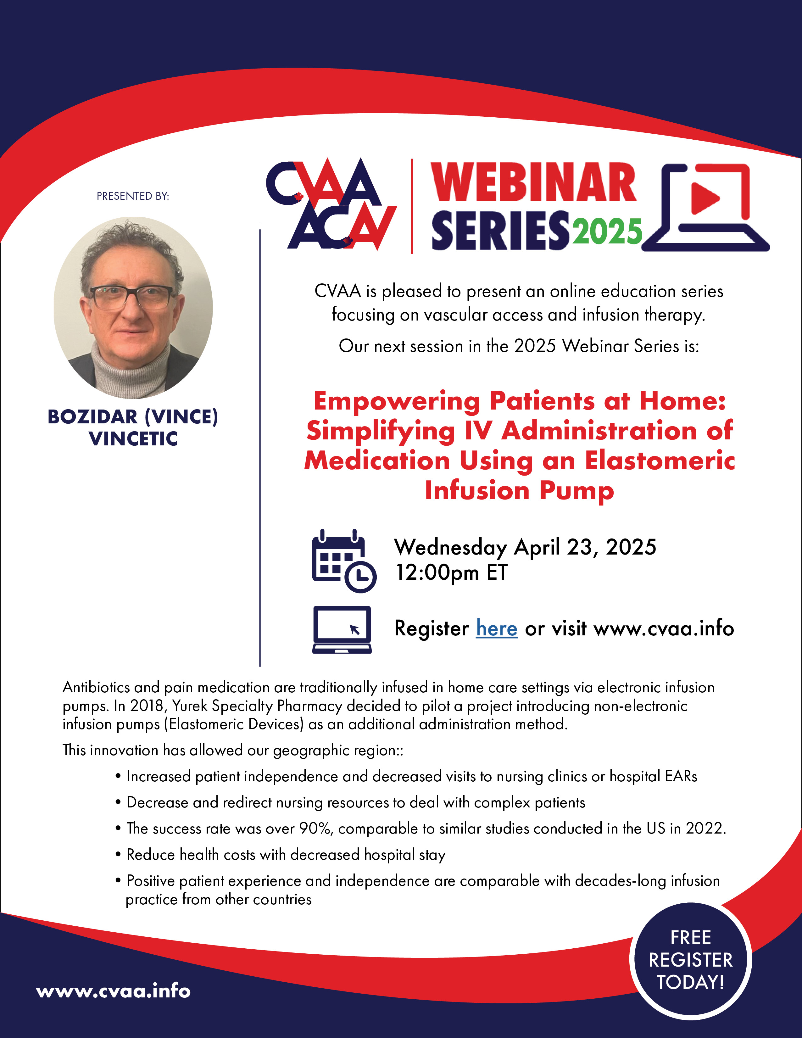 ARCHIVED SESSION: April 23, 2025 (full flyer here) Empowering Patients at Home: Simplifying IV Administration of Medication Using an Elastomeric Infusion Pump Presented by Bozidar (Vince) Vincetic. To access the recording, log in and view under Members Area> CVAA Webinar Series