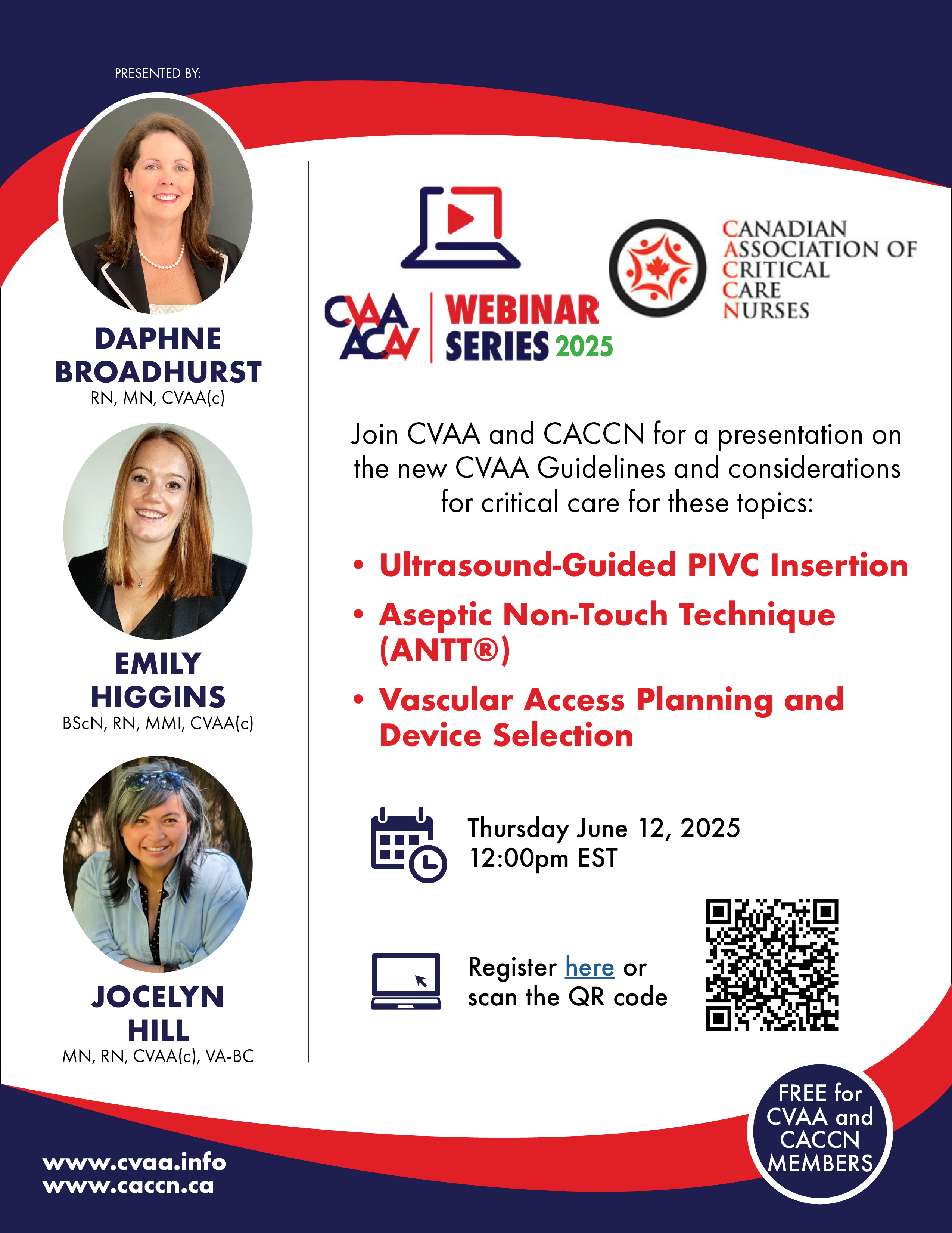 ARCHIVED SESSION: June 12, 2025 (full flyer here) CVAA Webinar Series: CVAA Guidelines and Considerations for Critical Care (joint with CACCN )presented by Daphne Broadhurst, RN, MN, CVAA(c), Emily Higgins, BScN, RN, MMI, CVAA(c), Jocelyn Hill, MN, RN, CVAA(c), VA-BC To access the recording, log in and view under Members Area> CVAA Webinar Series