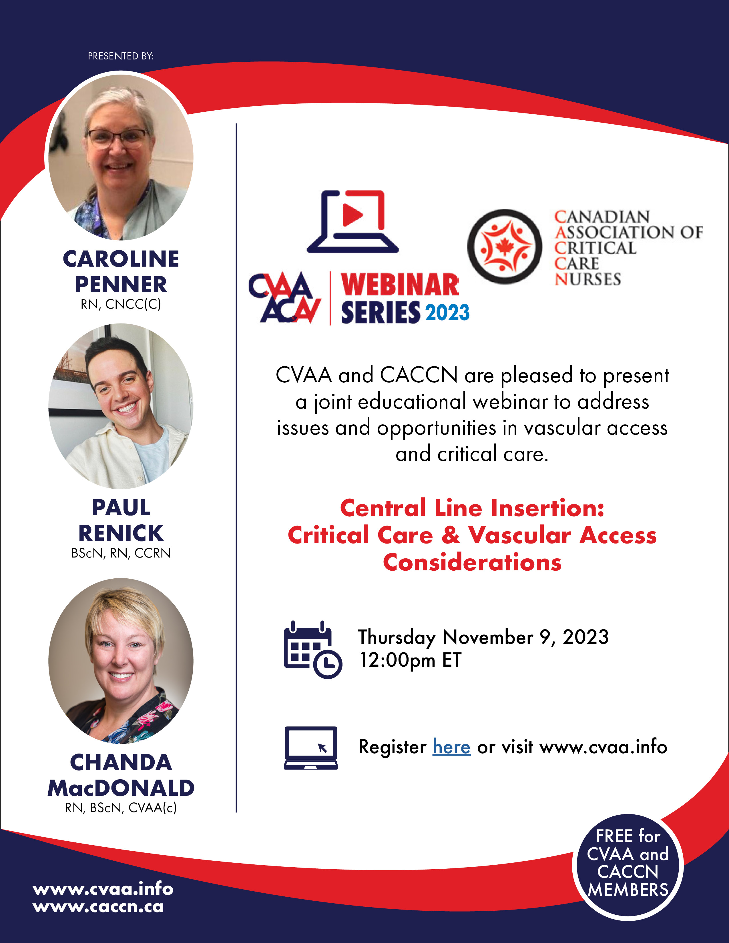 ARCHIVED SESSION November 9, 2023 (full flyer here) Joint Webinar with CACCN Central Line Insertion: Critical Care & Vascular Access Considerations presented by Caroline Penner, RN, CNCC(C), Paul Renick, BScN, RN, CCRN, Chanda MacDonald, RN, BScN, CVAA(c) To access the recording, log in and view under Members Area> CVAA Webinar Series