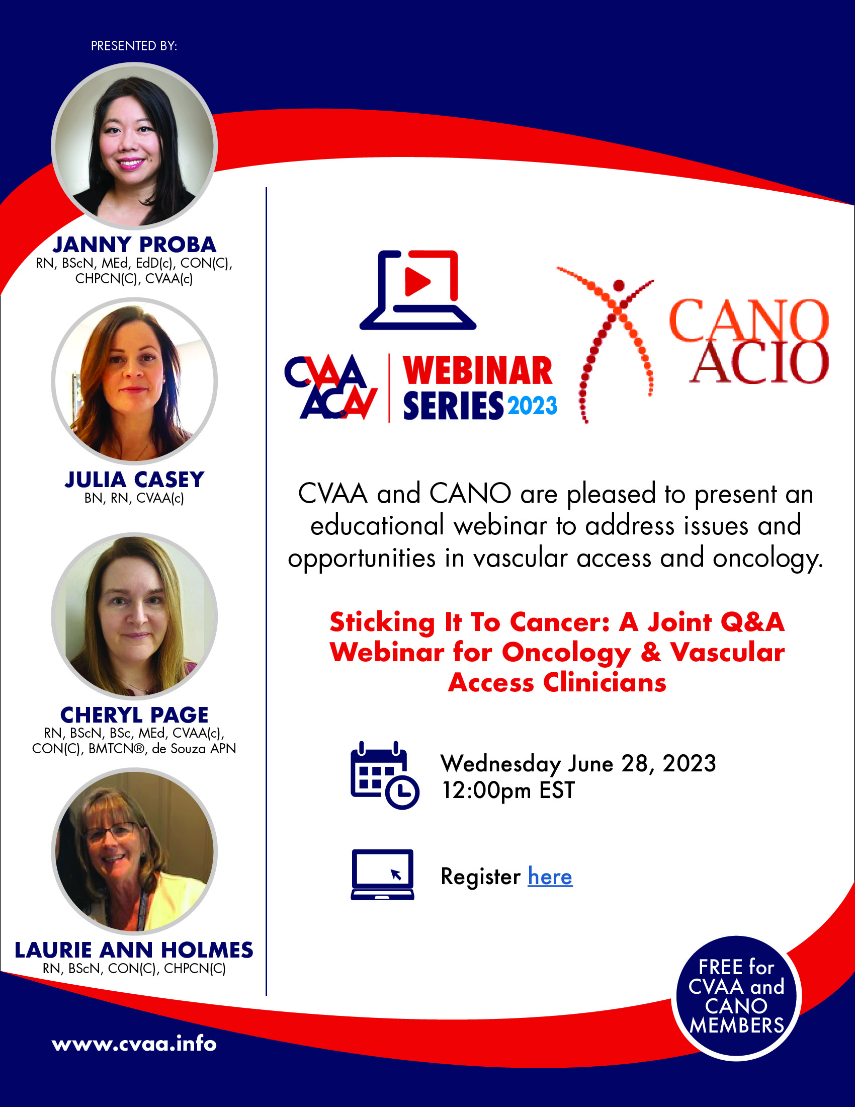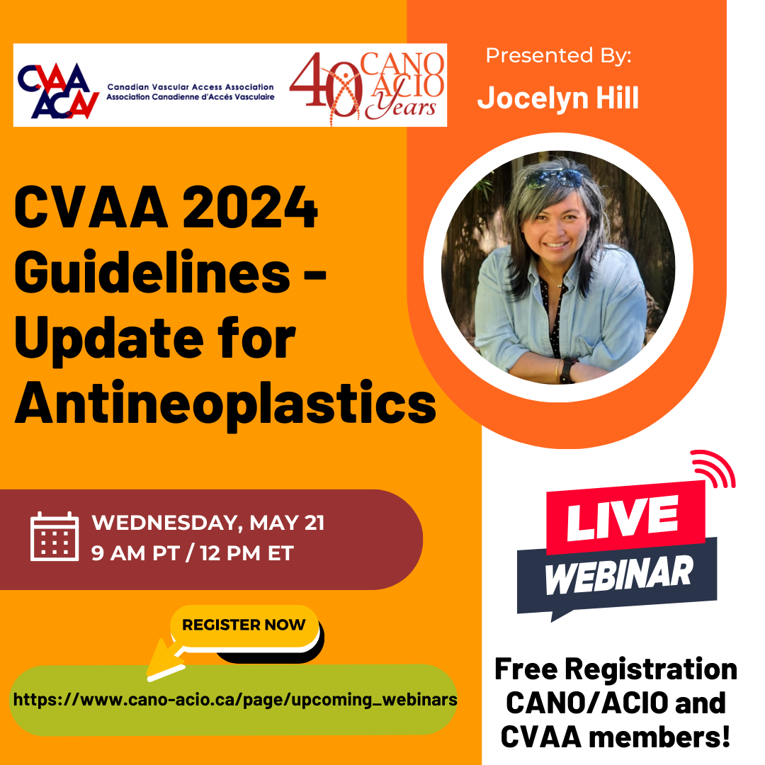 ARCHIVED SESSION June 28, 2023 (full flyer here) Sticking It To Cancer: A Joint Q&A Webinar for Oncology & Vascular Access Clinicians presented by Janny Proba, RN, BScN, MEd, EdD(c), CON(C), CHPCN(C), CVAA(c), Julia Casey, BN, RN, CVAA(c) , Cheryl Page, RN, BScN, BSc, MEd, CVAA(c), CON(C), BMTCN®, de Souza APN & Laurie Ann Holmes, RN, BScN, CON(C), CHPCN©, a joint CVAA and CANO webinar. To access the recording, log in and view under Members Area> CVAA Webinar Series