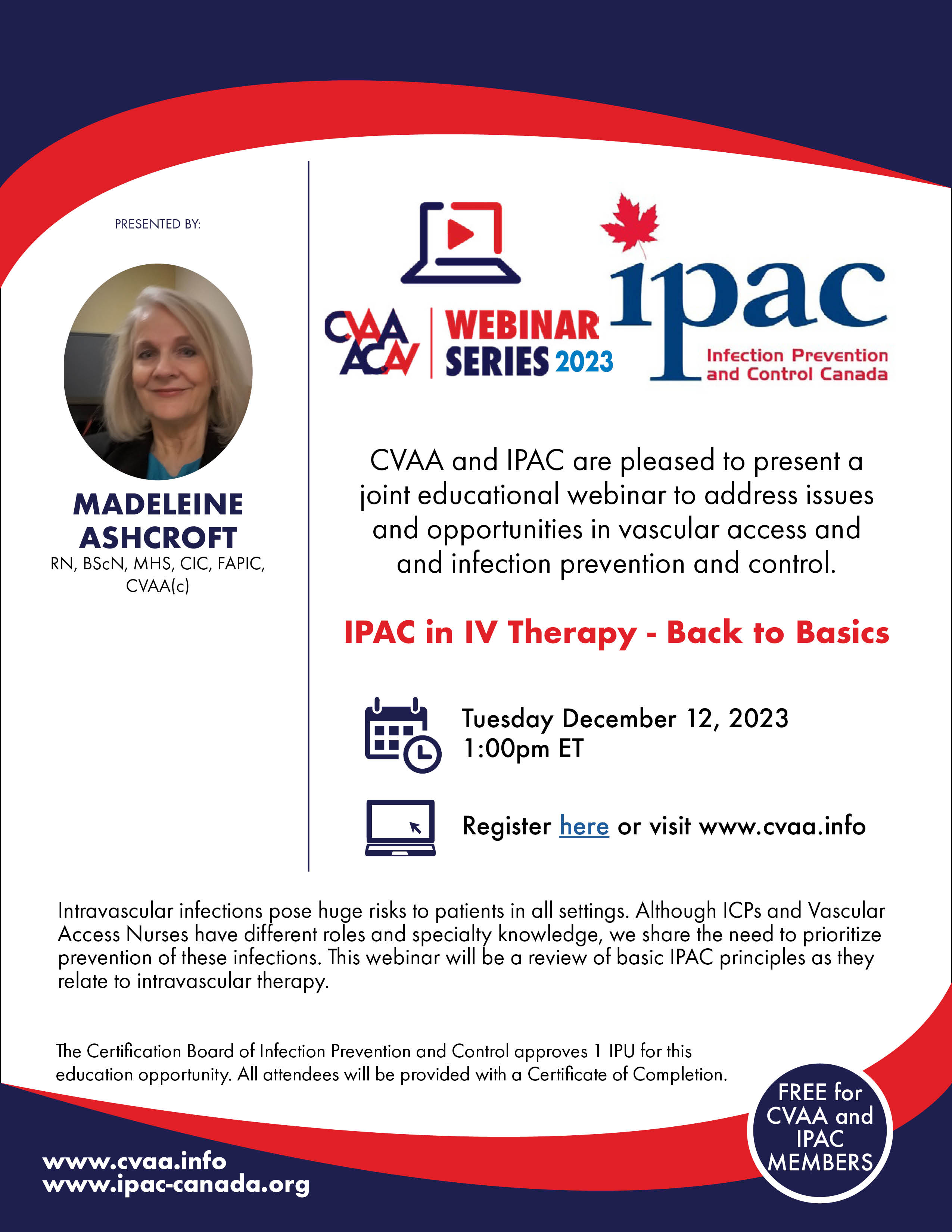 ARCHIVED SESSION: December 12, 2023 (full flyer here) Our second joint webinar with Infection Prevention & Control Canada IPAC in IV Therapy - Back to Basics presented by Madeleine Ashcroft, RN, BScN, MHS, CIC, FAPIC, CVAA(c). To access the recording, log in and view under Members Area> CVAA Webinar Series