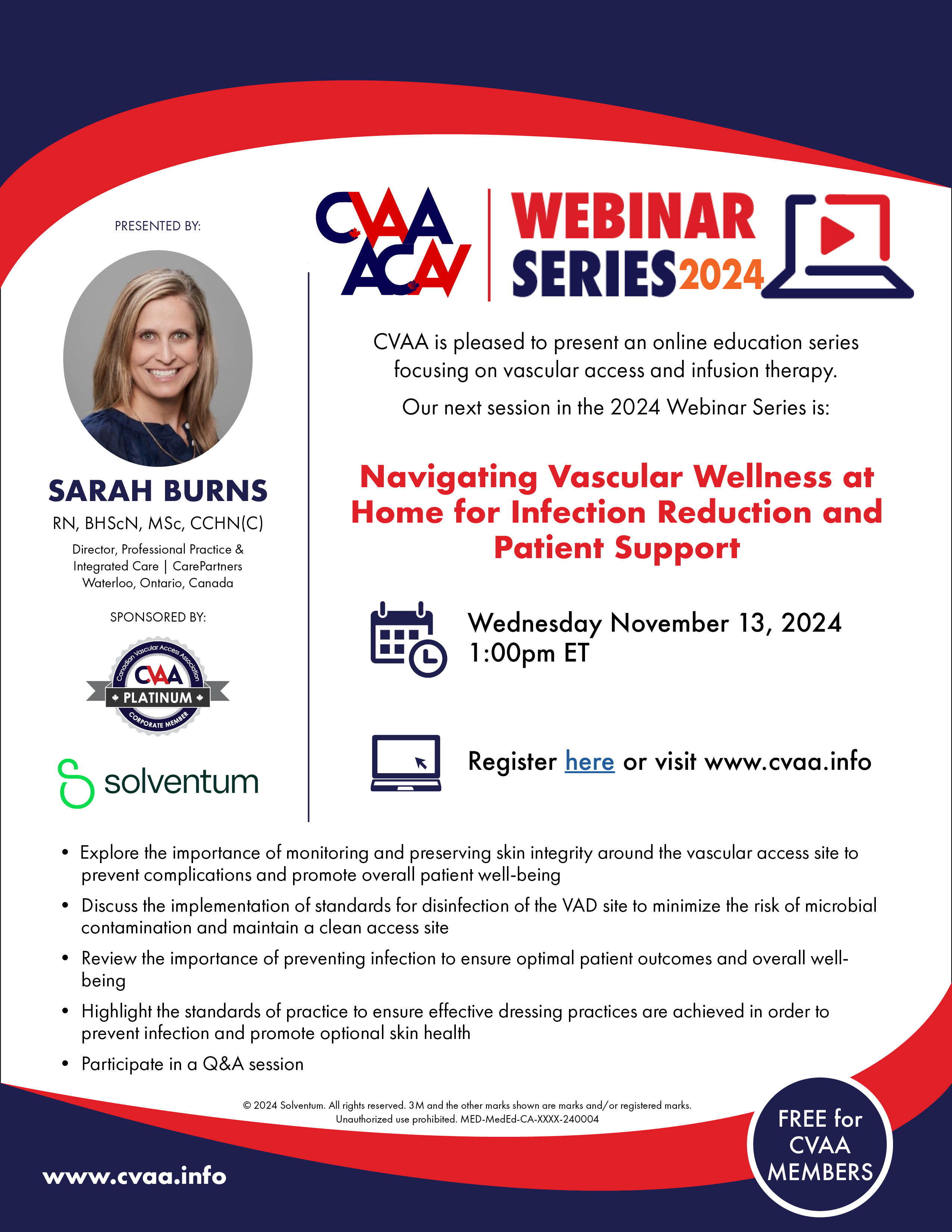 ARCHIVED SESSION: November 13, 2024 (full flyer here) Navigating Vascular Wellness at Home for Infection Reduction and Patient Support - Sarah Burns, RN, BHScN, MSc, CCHN(C) Sponsored by Solventum To access the recording, log in and view under Members Area> CVAA Webinar Series