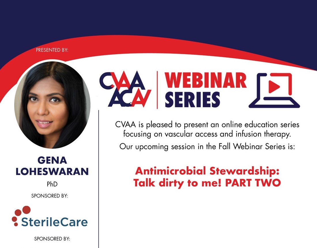 ARCHIVED SESSION September 13, 2023 (full flyer here) Changing our Focus: CLABSI to CA-BSI Prevention with a Few Simple Drops presented by Lori Kaczmarek, MSN, RN, VA-BC, sponsored by Adhezion Biomedical. To access the recording, log in and view under Members Area> CVAA Webinar Series