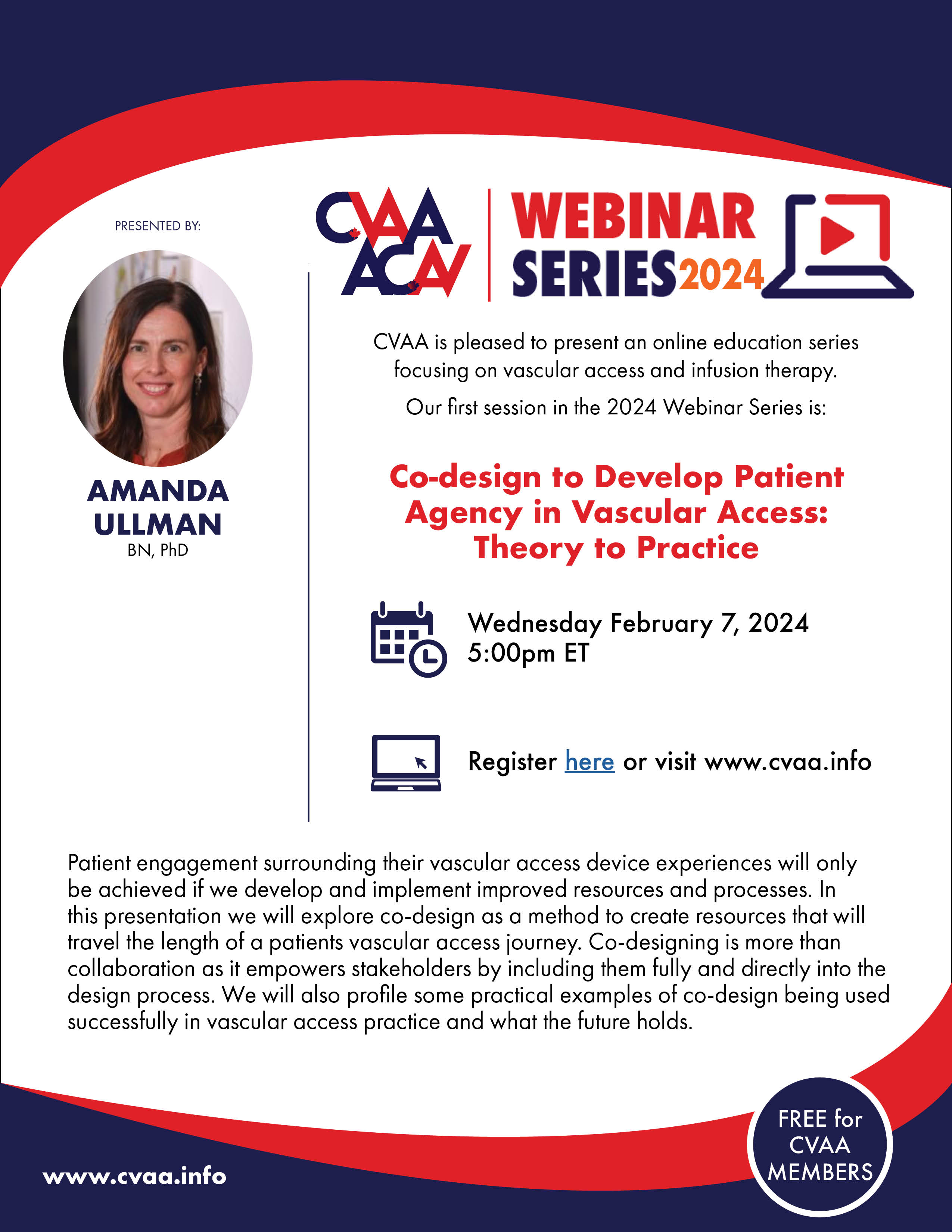 ARCHIVED SESSION: February 7, 2024 (full flyer here) Our first webinar of 2024: Co-design to Develop Patient Agency in Vascular Access: Theory to Practice presented by Amanda Ullman, BN, PhD. To access the recording, log in and view under Members Area> CVAA Webinar Series