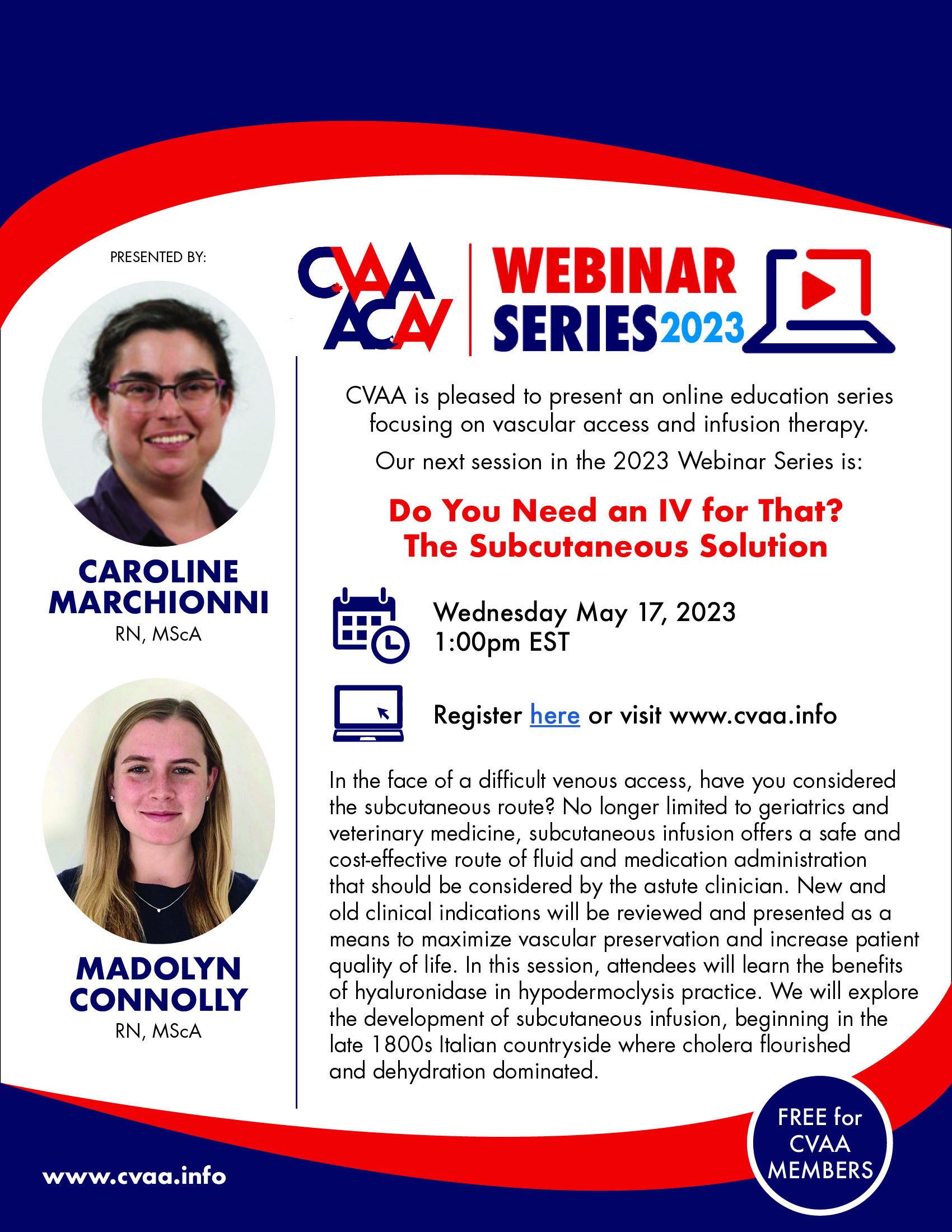 ARCHIVED SESSION May 17, 2023 (full flyer here) Do You Need an IV for That? The Subcutaneous Solution presented by Caroline Marchionni, RN, MScA, & Madolyn Connolly, RN, MScA. To access the recording, log in and view under Members Area> CVAA Webinar Series