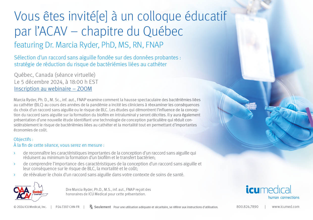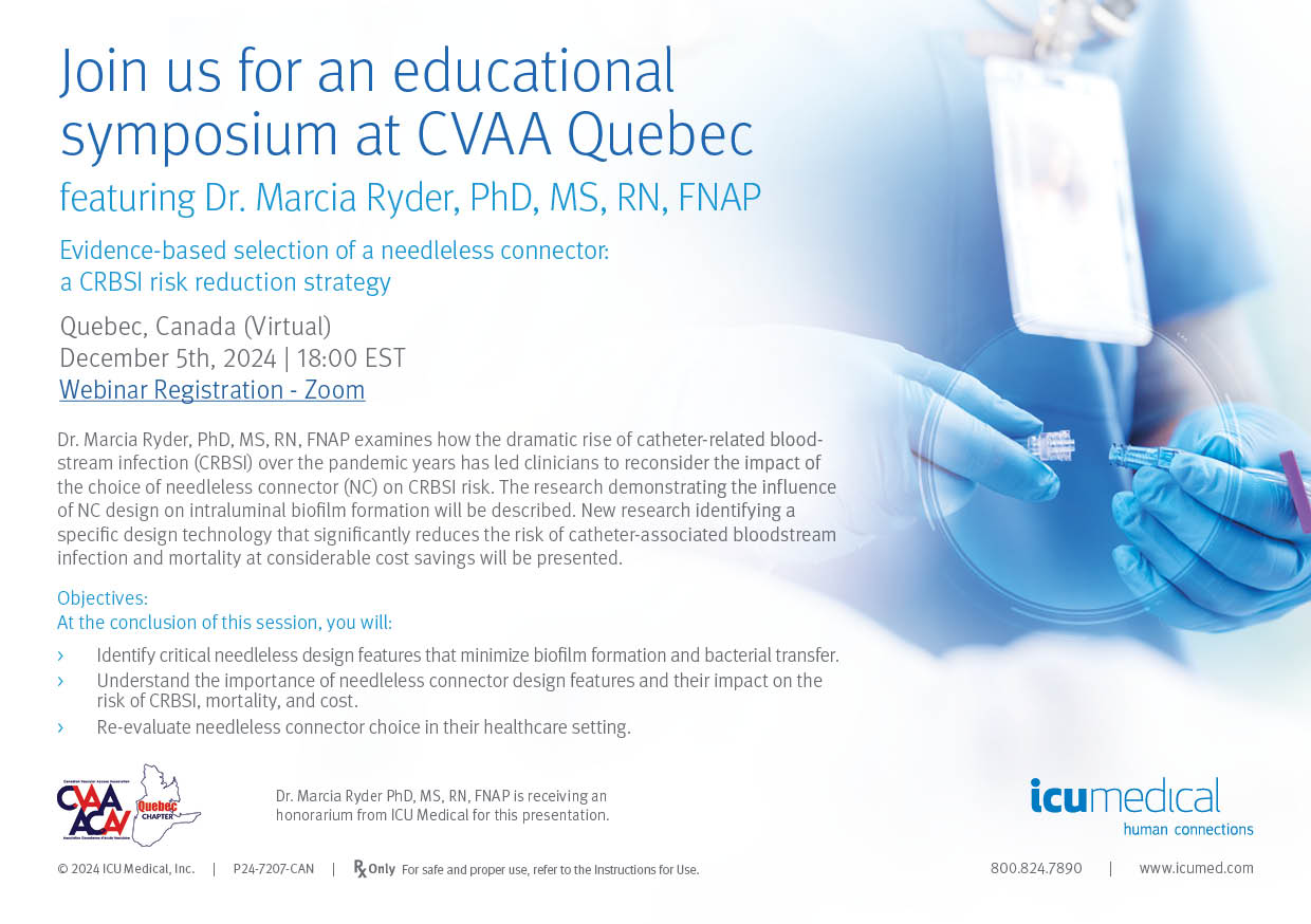 ARCHIVED SESSION: December 5, 2024 (full flyer here) Evidence-Based Selection of a Needleless Connector: A CRBSI Risk Reduction Strategy - Dr. Marcia Ryder Sponsored by ICU Medical BILINGUAL To access the recording, log in and view under Members Area> CVAA Webinar Series