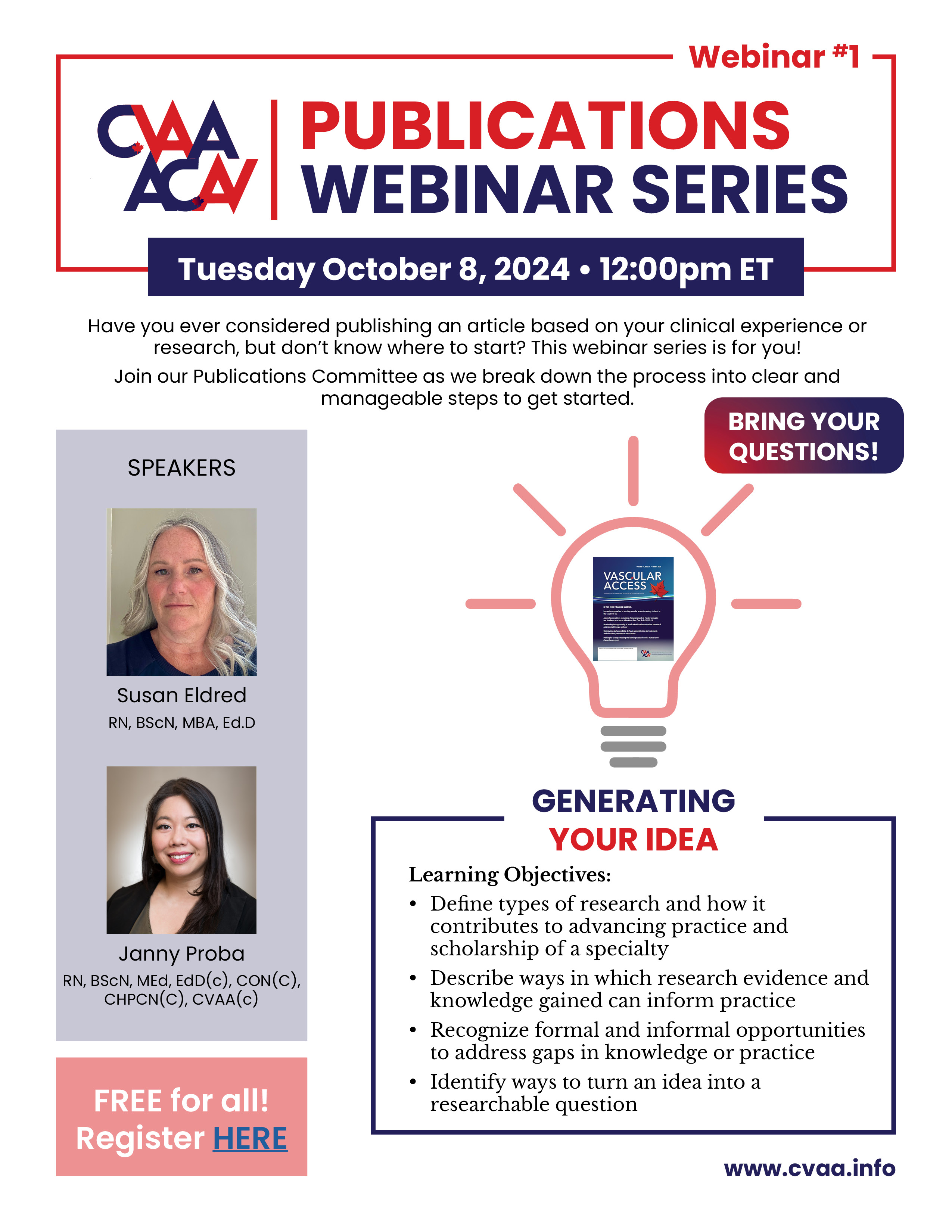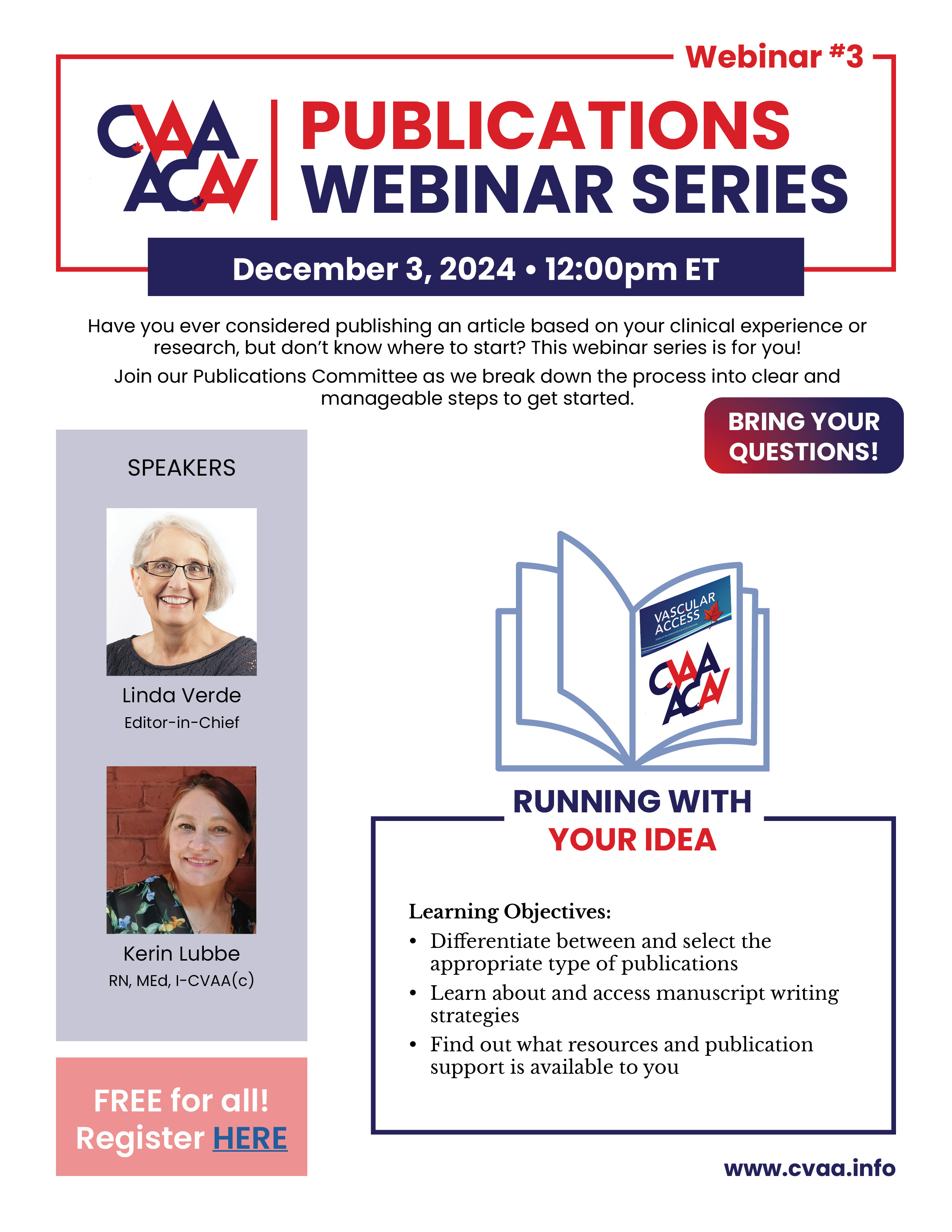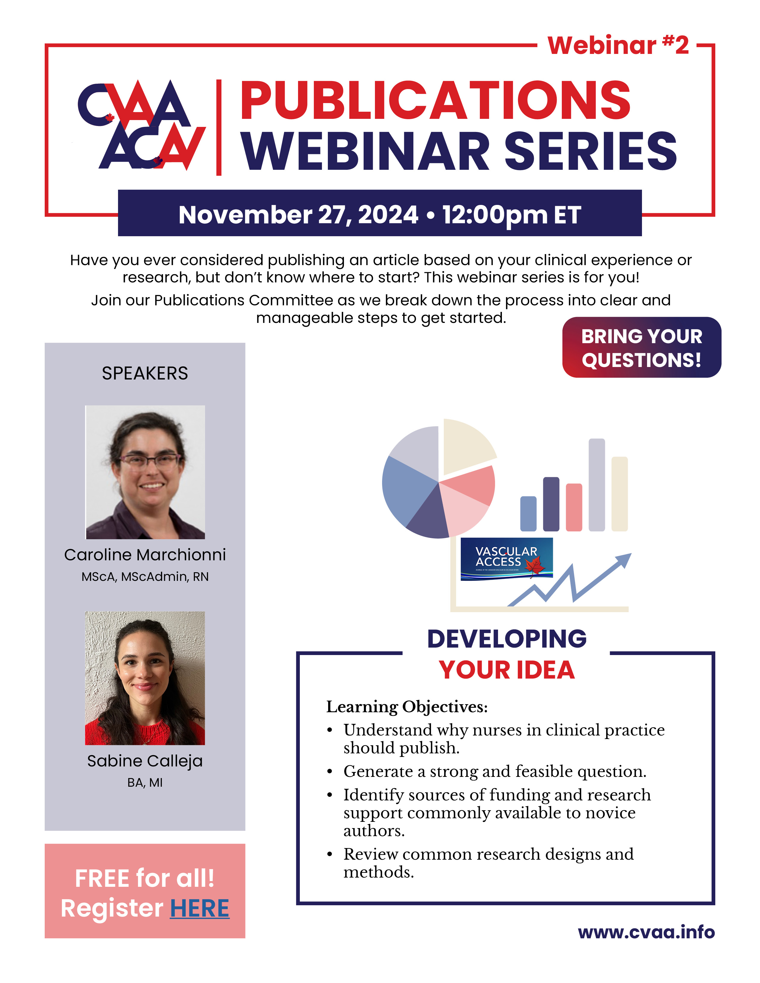 ARCHIVED SESSION: November 27, 2024 (full flyer here) CVAA Publications Webinar #2: Developing Your Idea - Caroline Marchionni, RN, MScAdmin, MScA & Sabine Calleja, BA, MI To access the recording, log in and view under Members Area> CVAA Webinar Series
