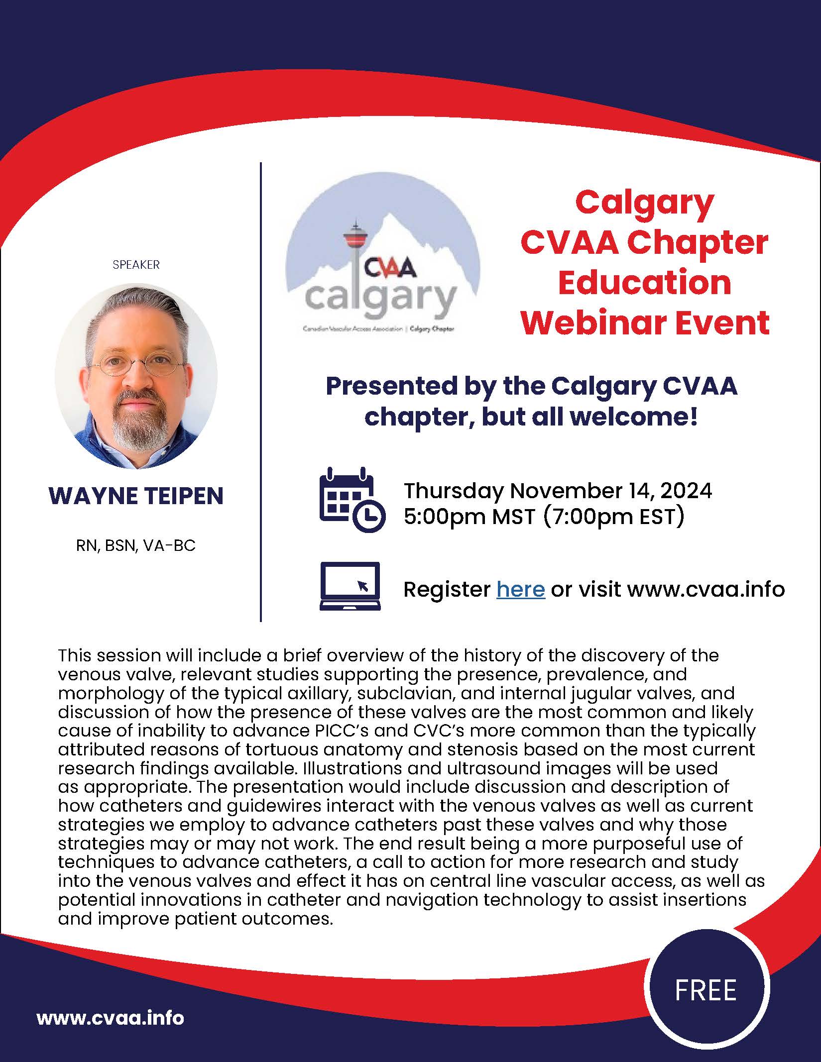 ARCHIVED SESSION: November 14, 2024 (full flyer here) Axillary, Subclavian, and Internal Jugular Venous Valves: A common Obstacle in PICC and CVC Placement - Wayne Teipen, RN BSN VA-BC Sponsored by Calgary CVAA Chapter To access the recording, log in and view under Members Area> CVAA Webinar Series