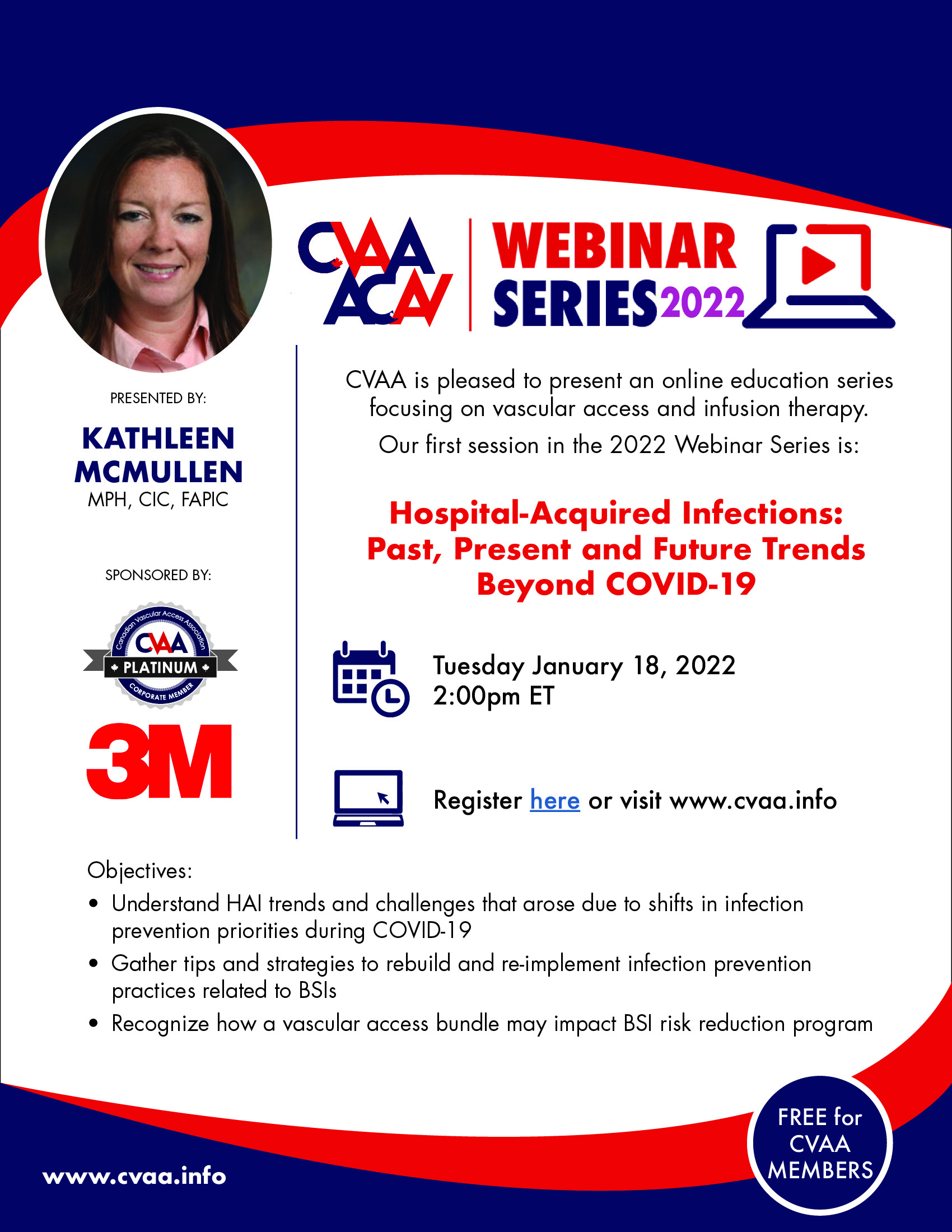 ARCHIVED SESSION January 18, 2022 (full flyer here) - Hospital-Acquired Infections: Past, Present and Future Trends Beyond COVID-19 by Kathleen McMullen, MPH, CIC, FAPIC Sponsored by3M Canada To access the recording, log in and view under Members Area> CVAA Webinar Series