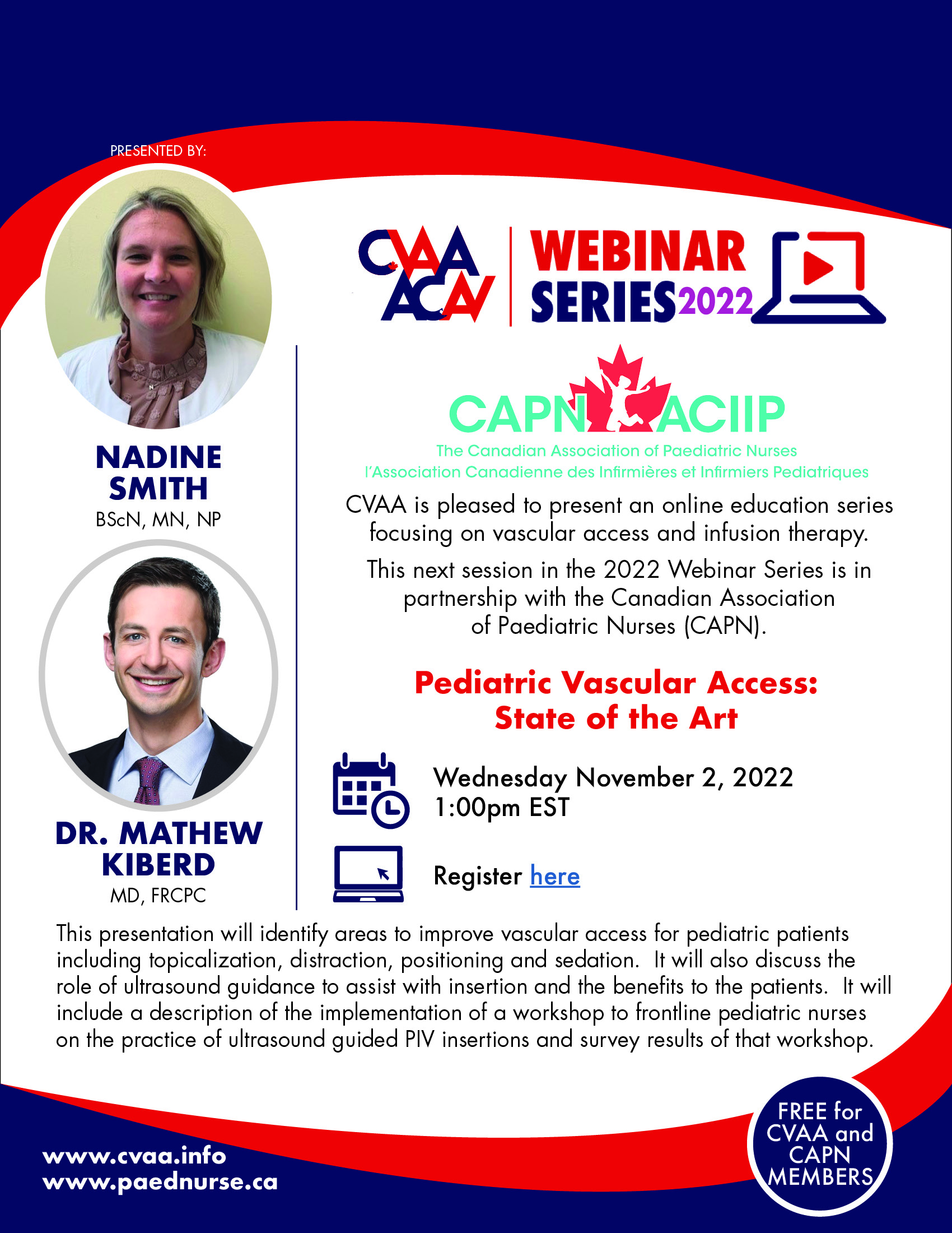 ARCHIVED SESSION November 2, 2022 (full flyer here) - Our first joint webinar with the Canadian Association of Paediatric Nurses (CAPN) Pediatric Vascular Access: State of the Art presented by Nadine Smith, BScN, MN, NP & Dr. Mathew Kiberd, MD, FRCPC To access the recording, log in and view under Members Area> CVAA Webinar Series
