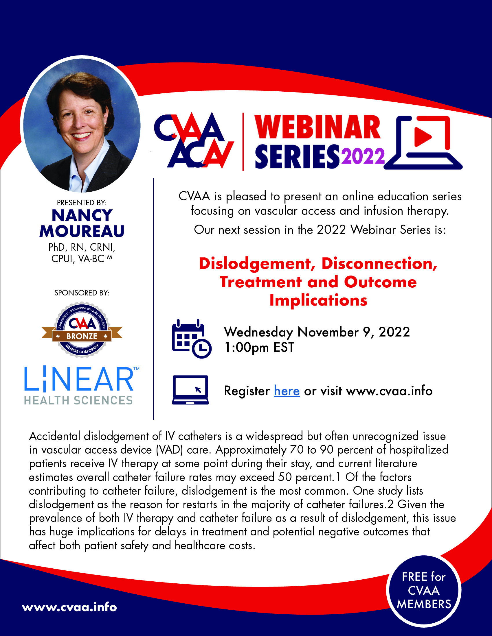 ARCHIVED SESSION November 9, 2022 (full flyer here) Dislodgement, Disconnection, Treatment and Outcome Implications presented by Nancy Moureau, PhD, RN, CRNI, CPUI, VA-BCTM sponsored by Linear Health Sciences. To access the recording, log in and view under Members Area> CVAA Webinar Series