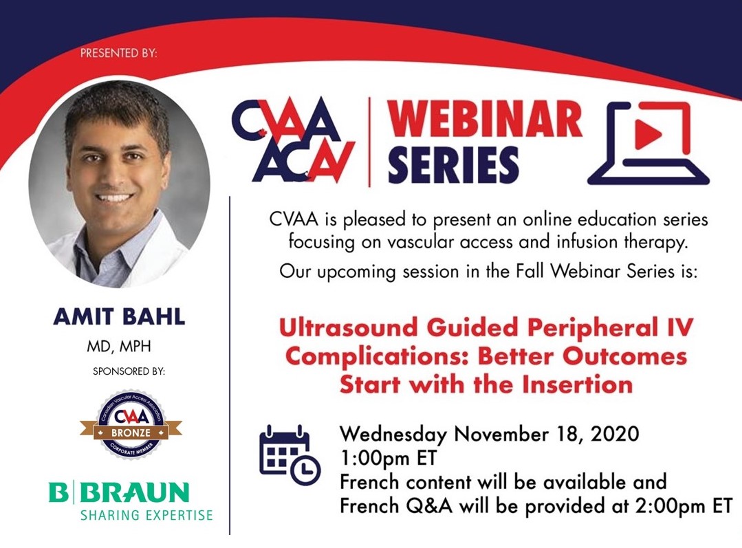 November 18, 2020 (full flyer here) - Ultrasound Guided Peripheral IV Complications: Better Outcomes Start with the Insertion: Amit Bahl MD, MPH (Sponsored by B.Braun) To access the recording, log in and view under Members Area> CVAA Webinar Series