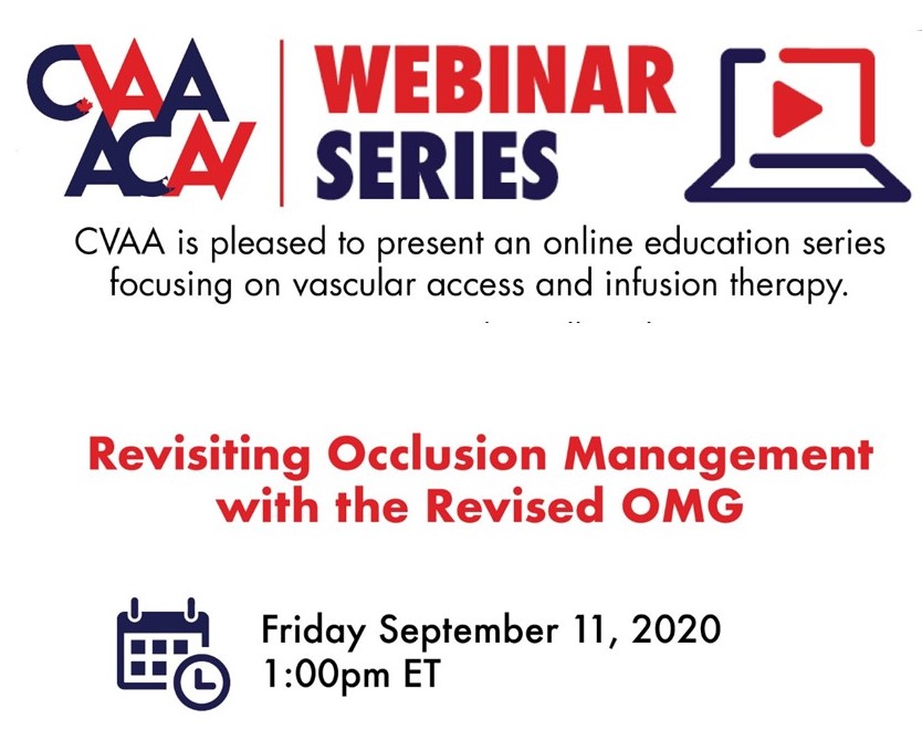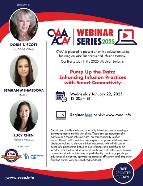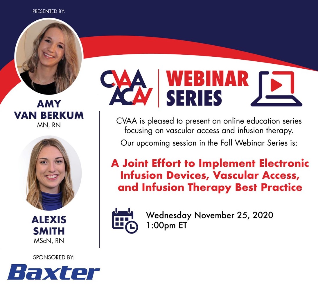 November 25, 2020 (full flyer here) - A Joint Effort to Implement Electronic Infusion Devices, Vascular Access, and Infusion Therapy Best Practice: Amy Van Berkum, MN, RN & Alexis Smith, MScN, RN (Sponsored by Baxter) To access the recording, log in and view under Members Area> CVAA Webinar Series