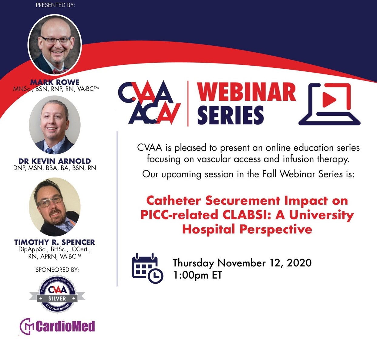 November 12, 2020 (full flyer here) - Catheter Securement Impact on PICC-related CLABSI: A University Hospital Perspective: Mark Rowe MNSc., BSN, RNP, RN, VA-BC™, Dr Kevin Arnold, DNP, MSN, BBA, BA, BSN, RN, Timothy R. Spencer, DipAppSc., BHSc., ICCert., RN, APRN, VA-BC™ (Sponsored by CardioMed) To access the recording, log in and view under Members Area> CVAA Webinar Series