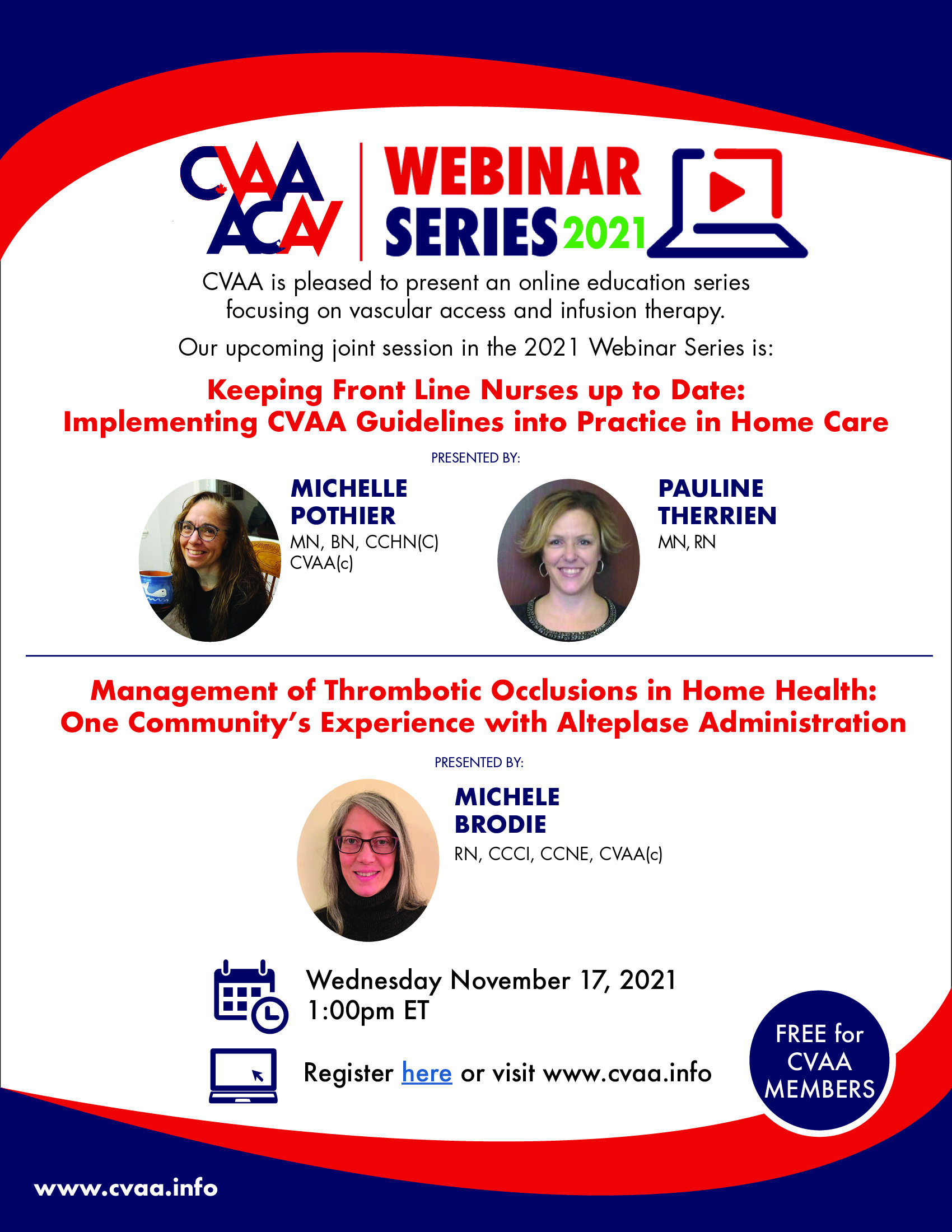 ARCHIVED SESSION November 17, 2021 (full flyer here) - Management of Thrombotic Occlusions in Home Health: One Community’s Experience with Alteplase Administration presented by Michele Brodie, RN, MN, CCCI, CCNE, CVAA(c) AND Keeping Front Line Nurses up to Date: Implementing CVAA Guidelines into Practice in Home Care presented by Michelle Pothier, MN, BN, RN, CCHN(C), CVAA(c) & Pauline Therrien, MN, RN To access the recording, log in and view under Members Area> CVAA Webinar Series