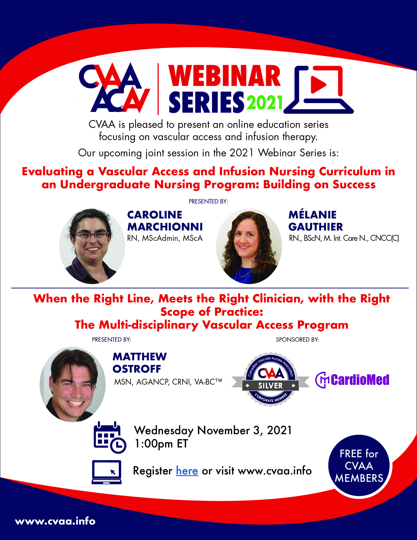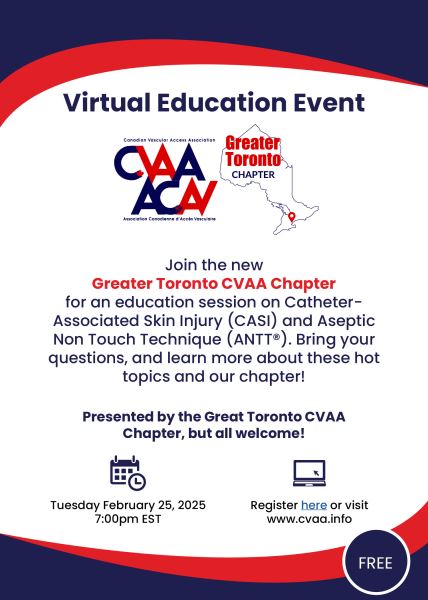ARCHIVED SESSION November 3, 2021 (full flyer here) - Evaluating a Vascular Access and Infusion Nursing Curriculum in an Undergraduate Nursing Program: Building on Success presented - Caroline Marchionni, RN, MScAdmin, MScA & Mélanie Gauthier, RN., BScN, M. Int. Care N., CNCC(C) AND When the Right Line, Meets the Right Clinician, with the Right Scope of Practice: The Multi-disciplinary Vascular Access Program presented - Matthew Ostroff, MSN, AGANCP, CRNI, VA-BC To access the recording, log in and view under Members Area> CVAA Webinar Series