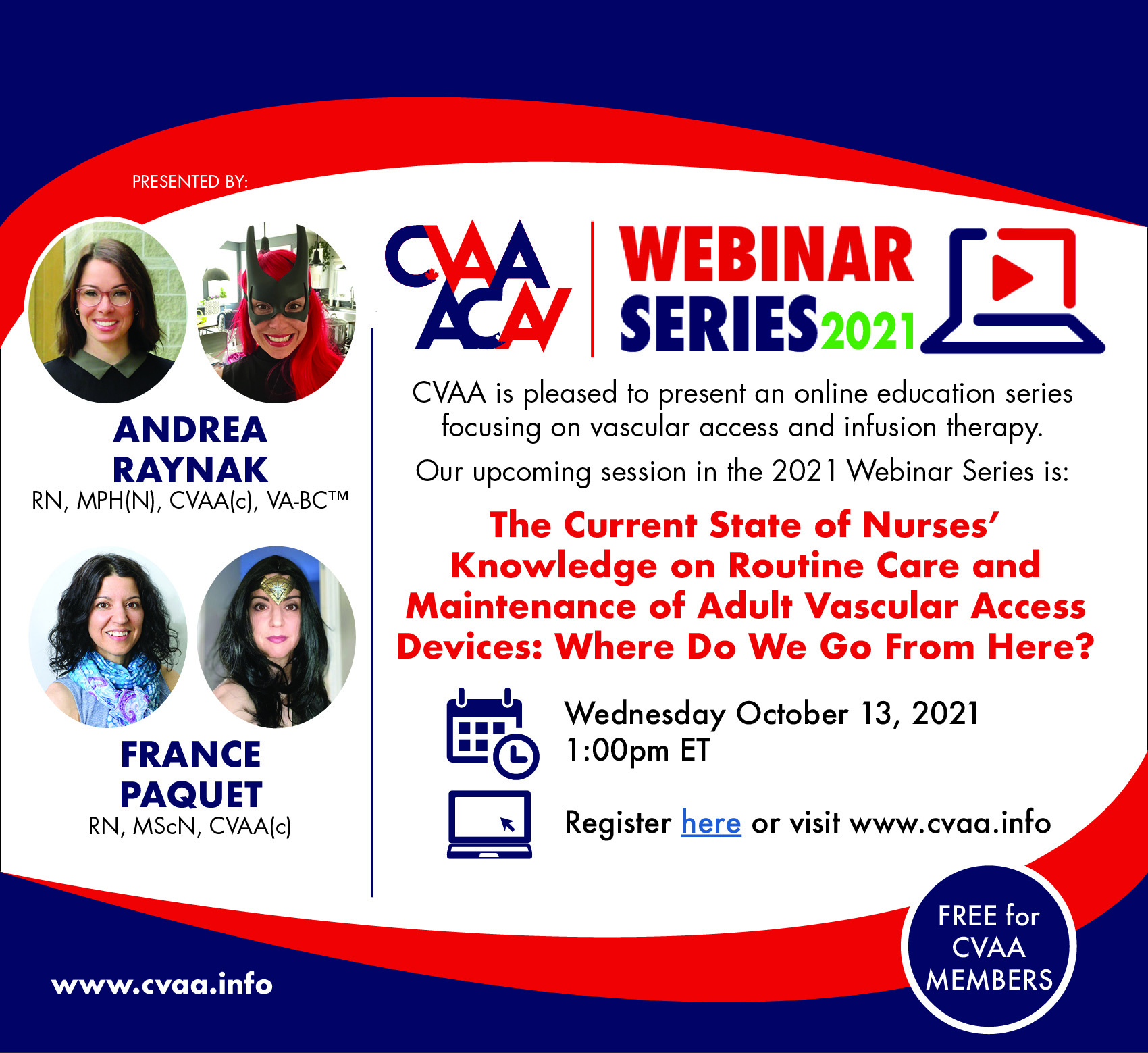 Wednesday October 13, 2021 (full flyer here) - The Current State of Nurses' Knowledge on Routine Care and Maintenance of Adult Vascular Access Devices: Where Do We Go From Here? - Andrea Raynak, RN, MPH(N), CVAA(c), VA-BCTM & France Paquet, RN, MScN, CVAA(c) To access the recording, log in and view under Members Area> CVAA Webinar Series