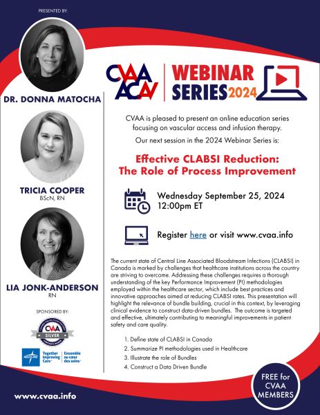 ARCHIVED SESSION: September 25, 2024 (full flyer here) Effective CLABSI Reduction: The Role of Process Improvement - Dr. Donna Matocha, Tricia Cooper, BScN, RN, Lia Jonk- Anderson, RN Sponsored by Medline To access the recording, log in and view under Members Area> CVAA Webinar Series